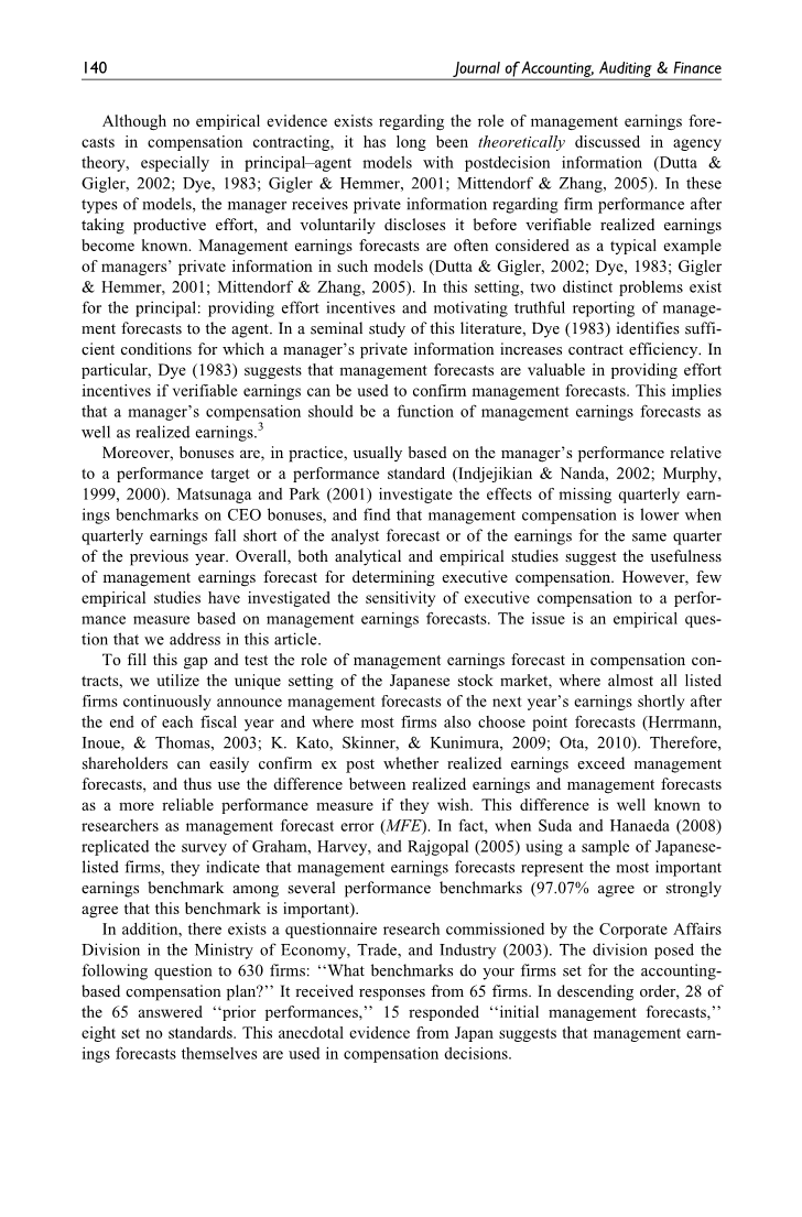 尽管没有关于管理收入预测在薪酬合同中的作用的经验证据,但在代理理论中,尤其是在具有后决策信息的委托-代理模型中,它在理论上已经进行了长期的讨论(Dutta&Gigler,2002; Dye,1983; Gigler& Hemmer,2001; Mittendorf和Zhang,2005)。在这些类型的模型中,管理者在采取了生产性努力后会收到有关公司绩效的私人信息,并在可验证的已实现收入已知之前主动披露。在这种模型中,管理人员收入预测通常被视为管理人员私人信息的典型示例(Dutta&Gigler,2002; Dye,1983; Gigler&Hemmer,2001; Mittendorf&Zhang,2005)。在这种情况下,委托人存在两个不同的问题:提供激励措施和激励向代理商真实地报告管理预测。在对这些文献的开创性研究中,Dye(1983)指出了经理的私人信息可以提高合同效率的充分条件。尤其是,Dye(1983)提出,如果可验证的收入可以用来确认管理预测,那么管理预测在提供努力激励方面很有价值。这意味着经理的薪酬应该是管理层收入预测以及已实现收入的函数。