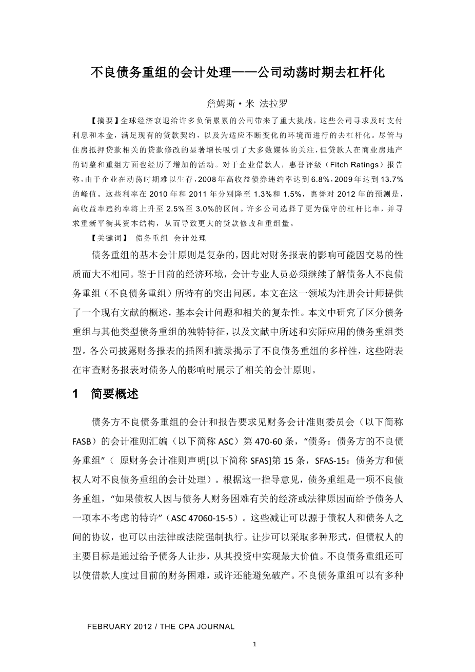 不良债务重组的会计处理——公司动荡时期去杠杆化外文翻译资料 2022-08-14 14:22:22 英语原文共 12 页,剩余内容已隐藏,支付完成后下载完整资料 英语译文共 13 页,剩余内容已隐藏,支付完成后下载完整资料 资料编号:[235659],资料为PDF文档或Word文档,PDF文档可免费转换为Word 原文和译文剩余内容已隐藏,您需要先支付 30元 才能查看原文和译文全部内容!立即支付 发小红书推广免费获取该资料资格。点击链接进入获取推广文案即可: Ai一键组稿 | 降AI率 | 降重复率 | 论文一键排版 PREVIOUS NEXT 您可能感兴趣的文章 预算创新、信息质量和部门绩效外文翻译资料 印度信息技术行业财务分析 ——以威普罗和印孚瑟斯公司为例外文翻译资料 真实性与公司治理外文翻译资料 财产责任保险公司投资组合选择的决定因素外文翻译资料 失衡:中国财政联邦制的意外结果外文翻译资料 财务弹性是影响亚洲企业投资效率的因素之一外文翻译资料 风险管理在审计中的地位及其重要性外文翻译资料 杠杆和公司绩效:机构环境是否重要?外文翻译资料 印度尼西亚企业社会、环境与财务绩效之间的关系外文翻译资料 为中国纯电动公交行业(PEB) 发展新型商业模式外文翻译资料
