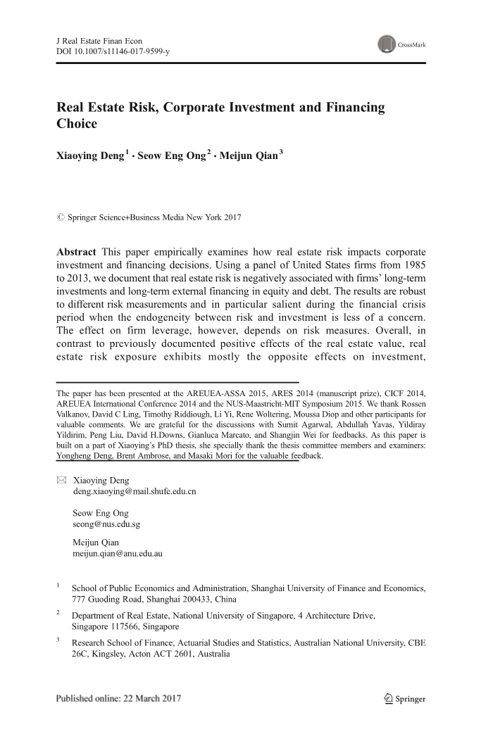 摘要:本文对房地产风险对企业投融资决策的影响进行了实证研究。以1985年至2013年的美国公司为研究对象,我们发现房地产风险与公司的长期投资和长期股权和债务外部融资呈负相关。这一结果对于不同的风险度量是稳健的,特别是在金融危机期间,当风险和投资之间的内生性较少被关注时,这一结果的表现尤其突出。然而,对企业杠杆的影响取决于风险度量。总的来说,与之前记录的房地产价值的积极影响相比,房地产风险敞口对投资、融资和资本结构的影响大多是相反的。这种差异与期权价值决定因素是一致的。本文的研究结果为房地产持有对企业决策的影响提供了新的视角,为对冲基金房地产策略表现不佳提供了新的解释,也印证了邓等人的理论预测。(2015年)。
