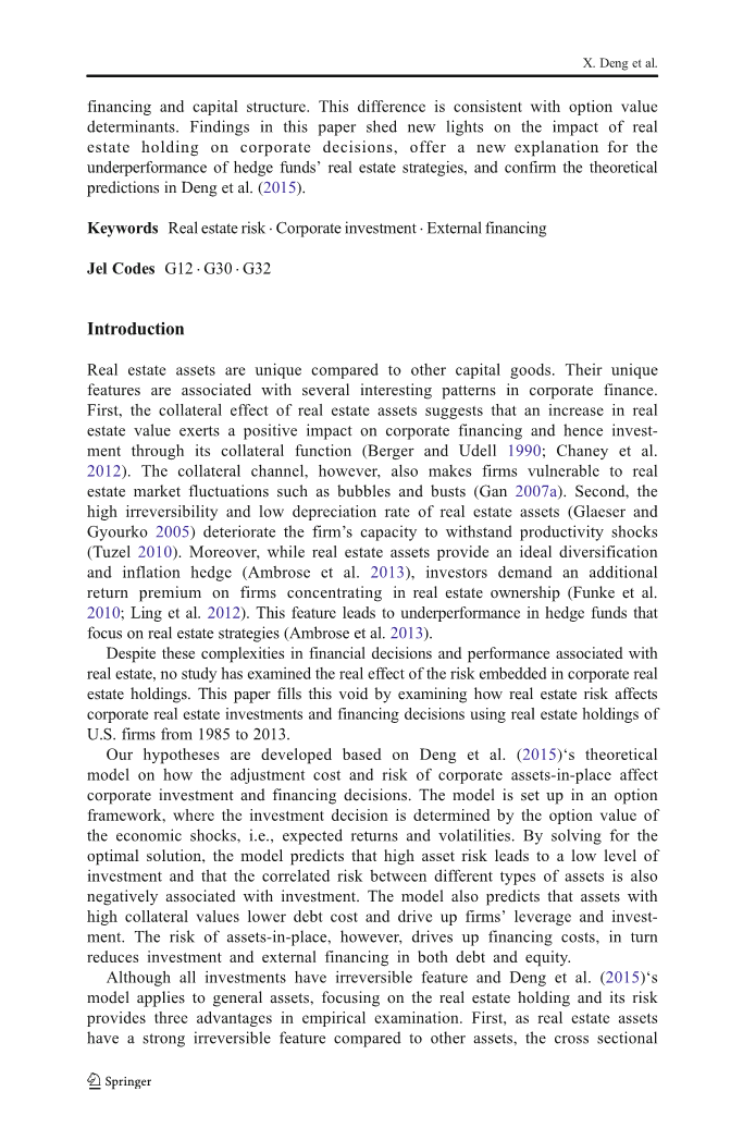 与其他资本货物相比,房地产资产是独一无二的。它们独特的特点与公司财务中几个有趣的模式有关。首先,房地产资产的抵押物效应表明,房地产价值的增加通过其抵押物功能对企业融资和投资产生积极影响( Berger和Udell,1990年; Chaney等人,2012年)。然而,抵押品渠道也使企业容易受到房地产市场波动的影响,如泡沫和萧条(Gan2007a)。其次,房地产资产的高不可逆性和低折旧率( Glaeser和 Gyourko,2005年)削弱了企业抵御冲击的能力( Tuzel,2010年)。此外,房地产资产提供了理想的多样化和通货膨胀对冲(Ambrose等人,2013年),投资者对专注于房地产所有权的公司要求额外的回报溢价(Funke等人,2010年;Ling等人,2012年)。这些特征导致专注于房地产策略的对冲基金表现不佳( Ambrose等人,2013年)。