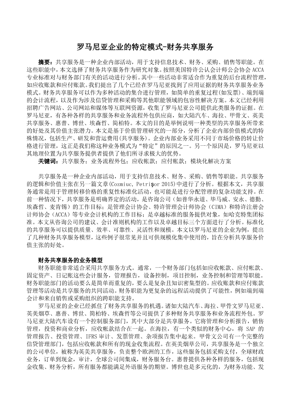 罗马尼亚企业的特定模式-财务共享服务外文翻译资料 2022-08-14 14:24:59 英语原文共 7 页,剩余内容已隐藏,支付完成后下载完整资料 英语译文共 6 页,剩余内容已隐藏,支付完成后下载完整资料 资料编号:[235645],资料为PDF文档或Word文档,PDF文档可免费转换为Word 原文和译文剩余内容已隐藏,您需要先支付 30元 才能查看原文和译文全部内容!立即支付 发小红书推广免费获取该资料资格。点击链接进入获取推广文案即可: Ai一键组稿 | 降AI率 | 降重复率 | 论文一键排版 PREVIOUS NEXT 您可能感兴趣的文章 预算创新、信息质量和部门绩效外文翻译资料 印度信息技术行业财务分析 ——以威普罗和印孚瑟斯公司为例外文翻译资料 真实性与公司治理外文翻译资料 财产责任保险公司投资组合选择的决定因素外文翻译资料 失衡:中国财政联邦制的意外结果外文翻译资料 财务弹性是影响亚洲企业投资效率的因素之一外文翻译资料 风险管理在审计中的地位及其重要性外文翻译资料 杠杆和公司绩效:机构环境是否重要?外文翻译资料 印度尼西亚企业社会、环境与财务绩效之间的关系外文翻译资料 为中国纯电动公交行业(PEB) 发展新型商业模式外文翻译资料