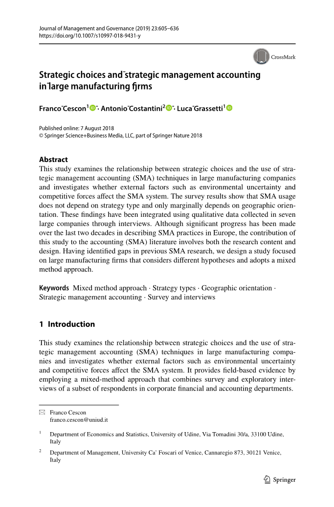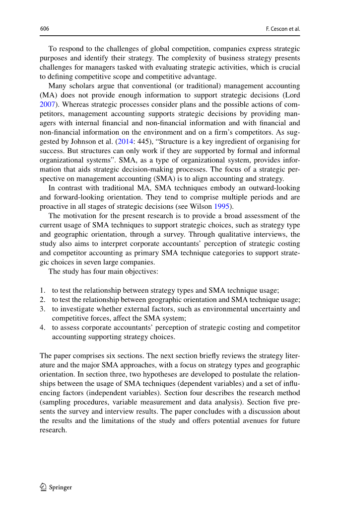 这篇论文包含六部分。下一个部分简要的回顾了战略的内涵和主要的战略成本会计方法,并强调了战略类型和地理定位。在第三部分中,提出了关于战略成本会计工具使用(变量)与一系列影响因素(自变量)之间关系的两种假设。第四部分描述研究方法(抽样步骤、变量测量和数据分析)。第五部分提出调研和面谈结论。这篇论文结尾讨论了研究的结论和局限性,并提供未来研究的可能性。
