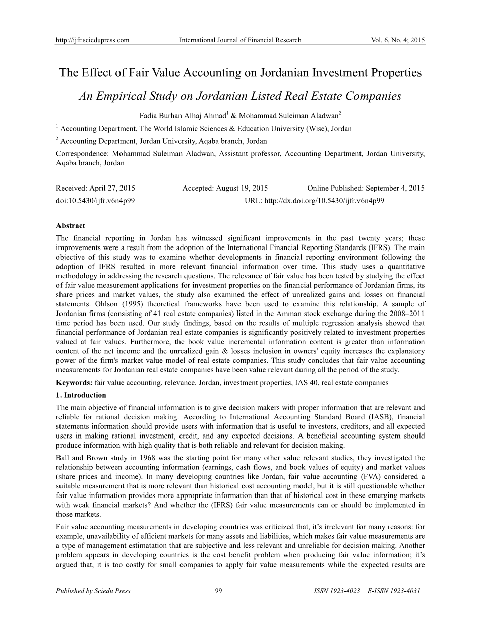 公允价值会计对约旦投资公司的影响:基于约旦房地产上市公司的实证研究