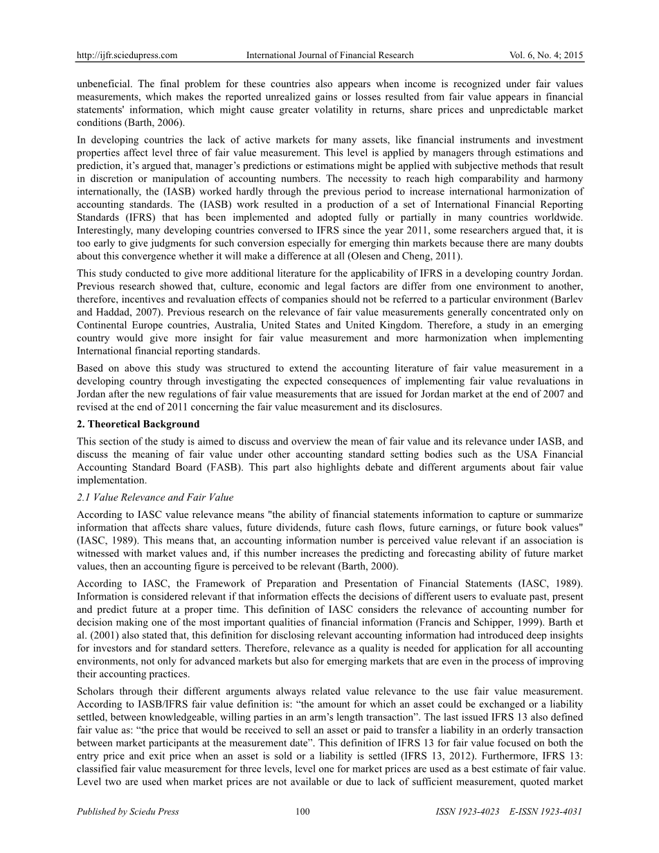 1968年的Ball和Brown研究是许多其他与价值相关的研究的起点,他们调查了会计信息(收益、现金流量和权益账面价值)与市场价值(股价和收入)之间的关系。在约旦等许多发展中国家,公允价值会计(FVA)被认为是合适的衡量方法,比历史成本会计模型更为相关,但在这些新兴市场中,公允价值信息是否提供了比历史成本更合适的信息,以及 (公允价值计量是否可以或应该在这些市场还存在疑问。