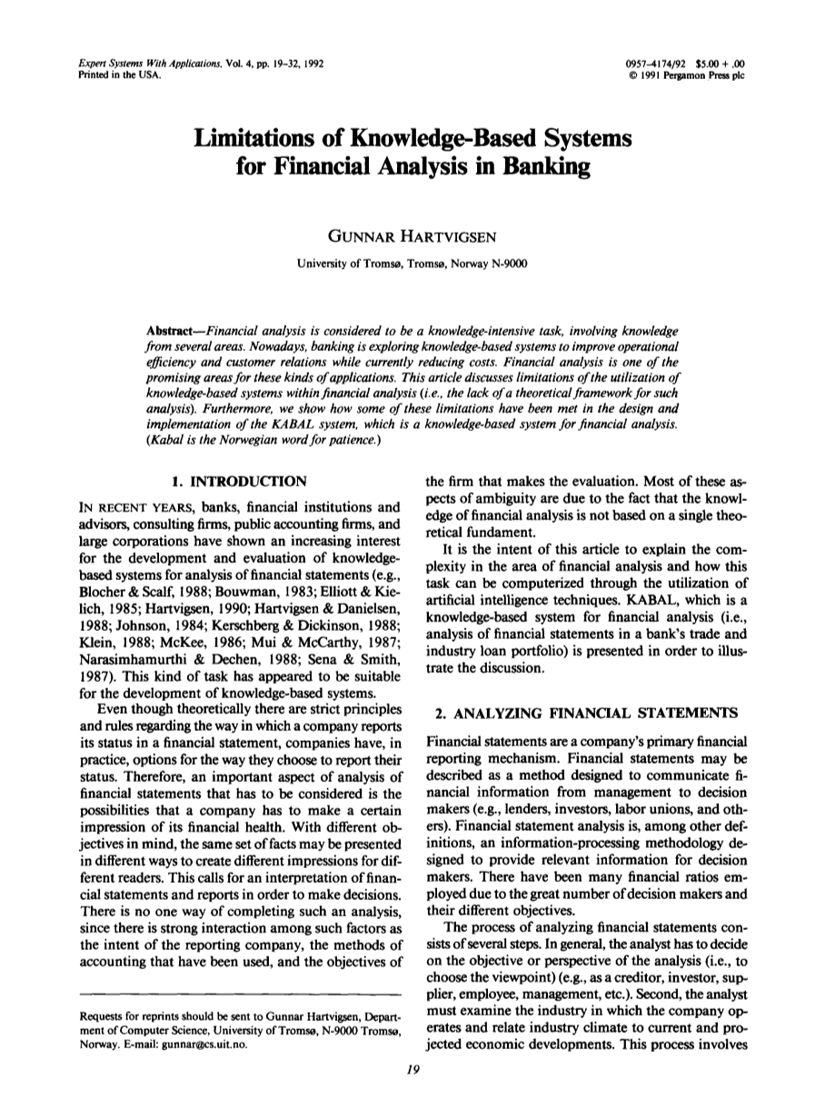 本文的目的是解释财务分析领域的复杂性,以及阐述如何利用人工智能技术将财务分析这一任务电脑化。KABAL,一个基于知识的财务分析系统(比如,对某银行的贸易和行业贷款组合中的财务报表进行分析),便是为了进行该领域方面的研究而研发的。