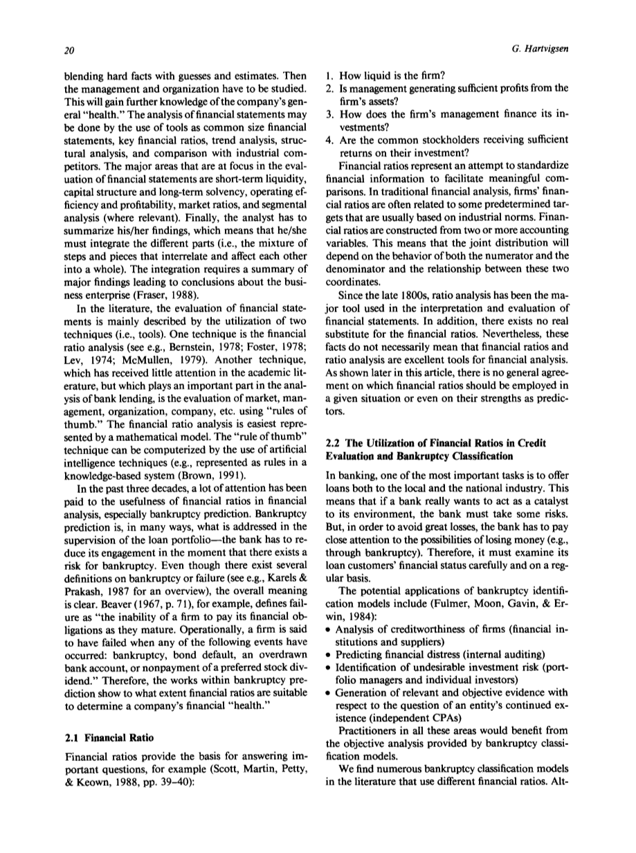 在文献中,财务报表的评价主要是通过利用两种技术/工具进行的。一种方法是财务比率分析(见Bernstein, 1978年;Foster,1978;Lev,1974;McMullen, 1979)。另一种方法是对市场、管理、组织、公司等进行评估(比如运用“经验法则”),这种方法在学术文献中很少受到重视,但在银行贷款的分析中却占有重要的地位。财务比率分析用数学模型表示最容易。“经验法则”技术可以通过使用人工智能技术(例如,基于知识系统中的规则)来实现计算机化(Brown, 1991)。