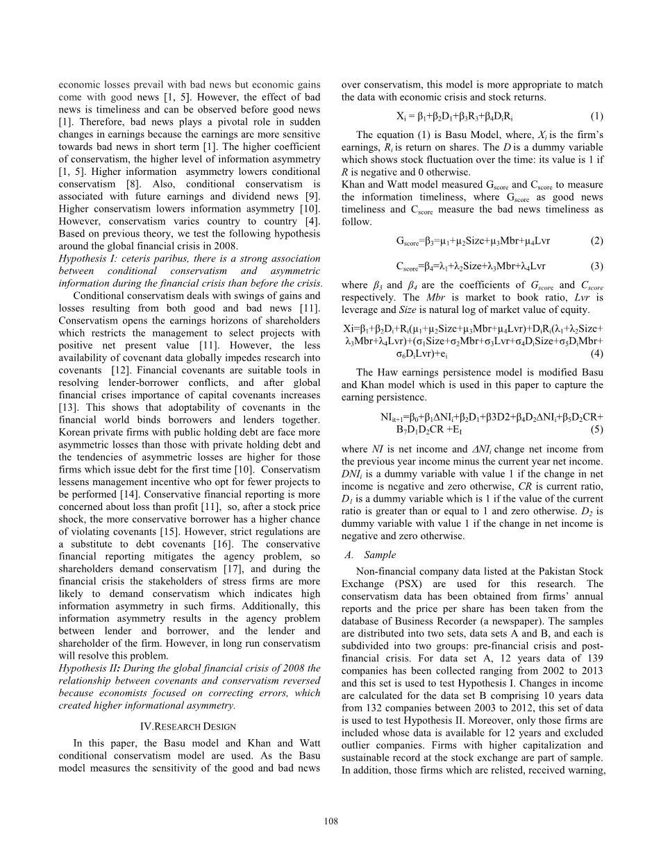 全球金融危机影响了股东、公司和银行之间的关系[7,p. 494]。危机期间,企业面临资金短缺和收益下降的压力,导致企业与利益相关者之间的信息不对称加剧。这种信息不对称的程度因国家而异,例如经济损失以坏消息为主,而经济收益以好消息为主[1,5]。然而,坏消息的影响是及时性的,可以在好消息[1]之前观察到。因此,坏消息在收益的突变中起着关键作用,因为在短期[1]中,收益对坏消息更加敏感。稳健性系数越高,信息不对称程度越高[1,5]。信息不对称程度越高,条件保守性[8]越低。另外,条件保守主义与未来收益和股息新闻[9]有关。保守性越高,信息不对称[10]越低。然而,不同国家的保守主义是不同的。基于先前的理论,我们对2008年全球金融危机的以下假设进行了检验。
