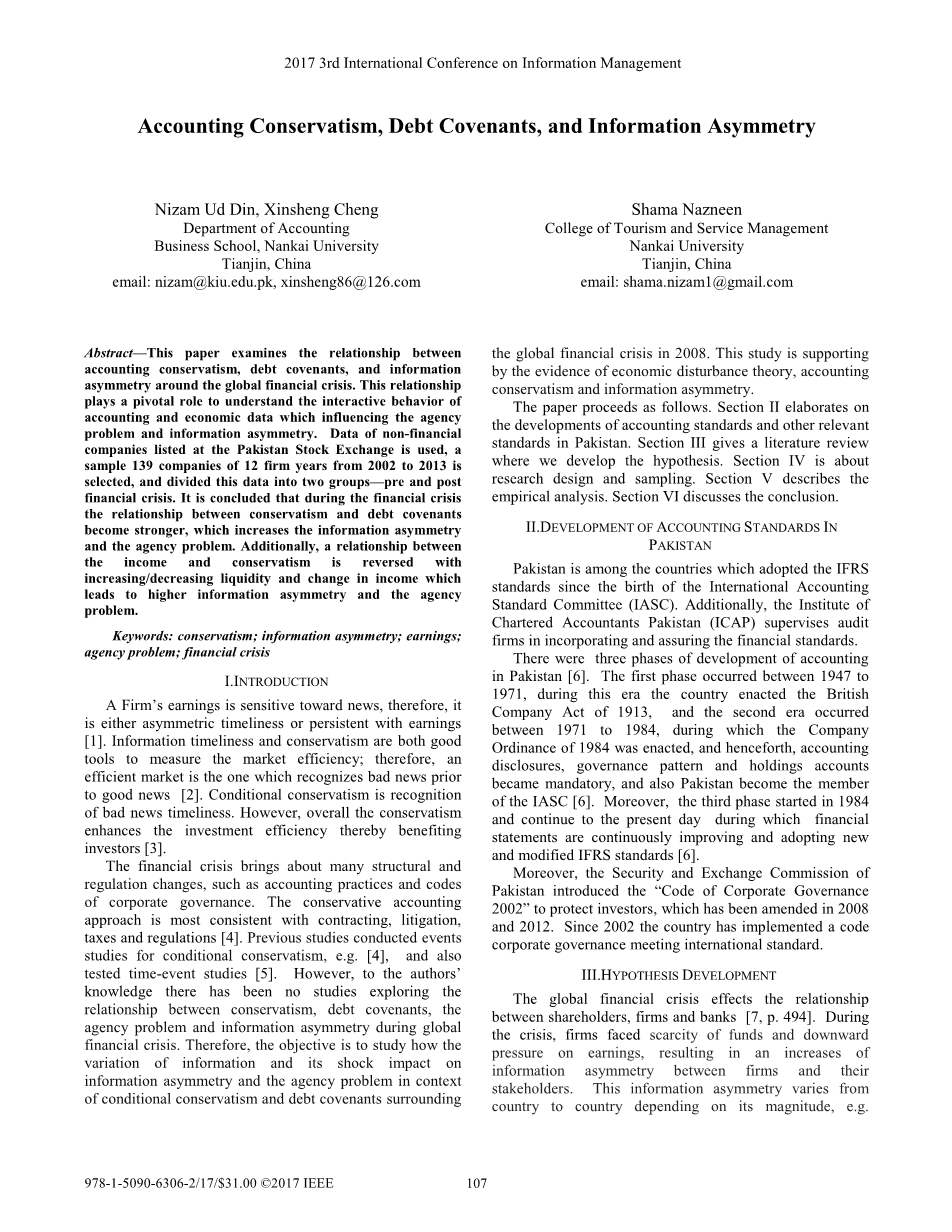 金融危机带来了许多结构性和监管方面的变化,比如会计实务和公司治理准则。保守的会计方法对于承包、诉讼、税收和法规来说是最一致的[4]。例如[4]之前的研究对条件性保守主义进行了事件研究,,也对时间-事件研究[5]进行了测试。然而,据作者所知,还没有研究探讨全球金融危机期间保守主义、债务契约、代理问题和信息不对称之间的关系。之前的研究对条件保守主义进行了事件研究,如[4],也对时间-事件研究[5]进行了测试。然而,据作者所知,目前还没有研究探讨全球金融危机期间保守主义、债务契约、代理问题和信息不对称之间的关系。因此,我们的目标是研究在2008年全球金融危机的条件性保守主义和债务契约的背景下,信息的变化及其对信息不对称和代理问题的冲击作用。本研究以经济扰动理论、会计稳健性和信息不对称为依据。