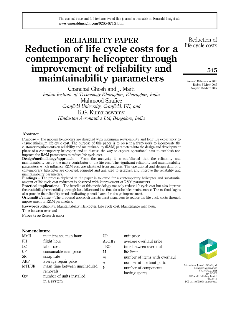 大多数现有的关于可靠性和维护性优化的文献都单独考虑了可靠性和维护性问题。对于特定的产品,客户更关心服务的可用性。系统可用性是其可靠性和维护性的一个函数,因此有必要同时对可靠性和维护性进行优化研究。产品的全生命周期成本法主要随可靠性和维护性措施而变化。因此,可以通过改进可靠性和维护性措施来降低全生命周期成本法。在本研究中,我们提出一个架构,在概念设计阶段整合研发与维护的特性,以降低可靠性和维护成本,然后,我们提出一种方法,以获取来自运营舰队的反馈,并减少维护工作。为此,确定了影响可靠性和维护成本的因素,建立了可靠性和维护性的成本组件,并根据运行数据估计成本组件。对某型直升机的运行数据进行了整理和分析,提高了可靠性和维修性参数。