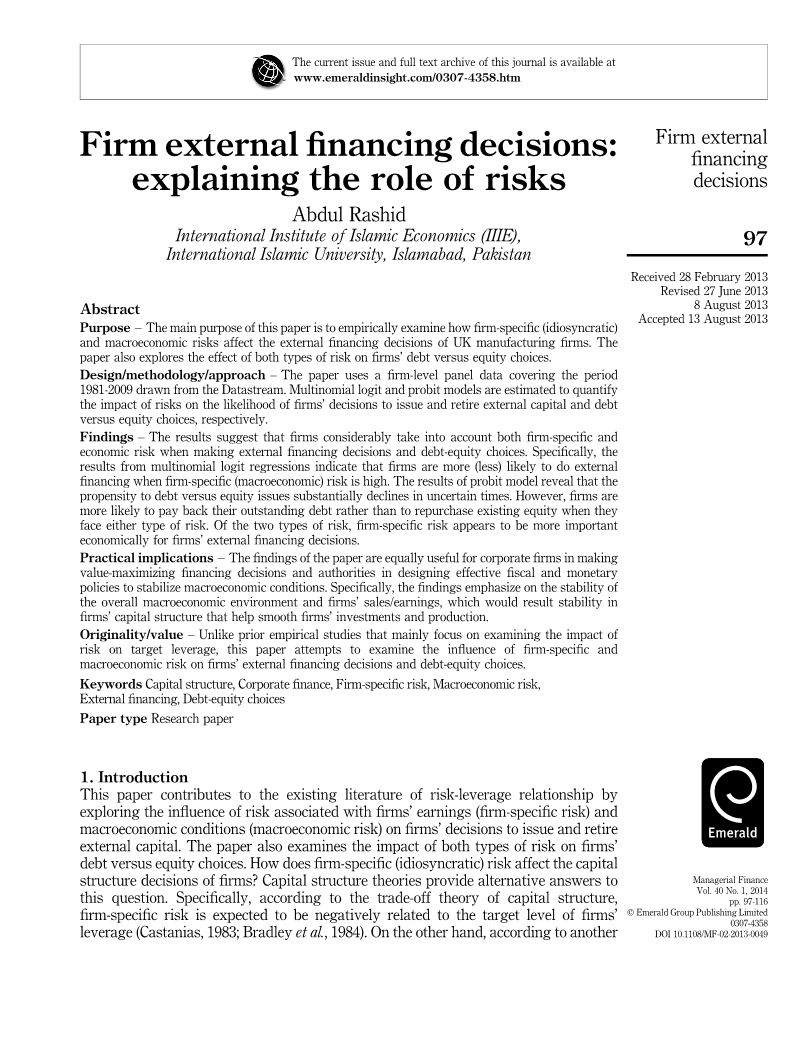 原创性/价值 - 与之前主要关注于研究风险对目标杠杆影响的实证研究不同,本文试图研究企业特定和宏观经济风险对企业外部融资决策和债务权益选择的影响。