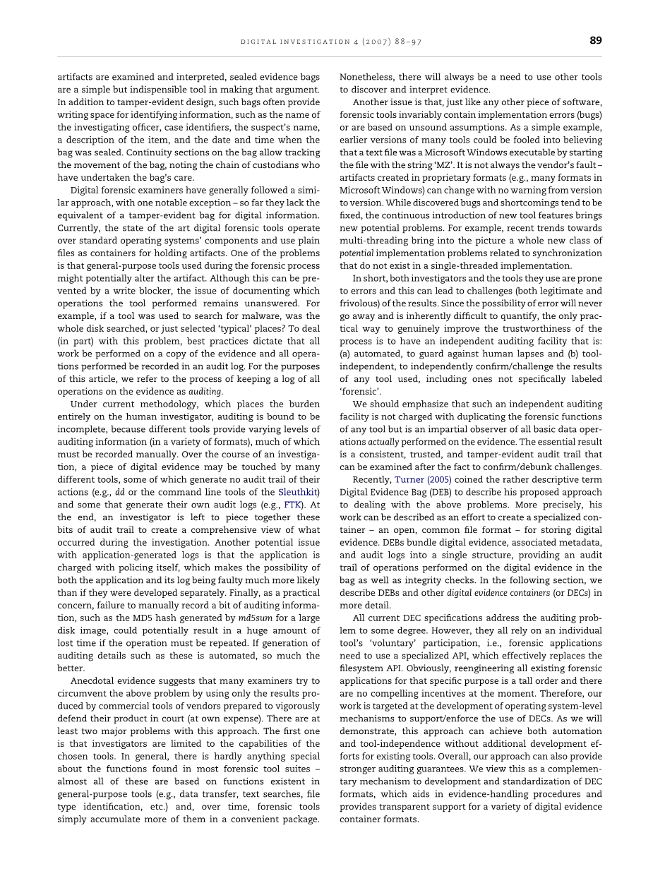 最近,特纳(2005)创造了相当的描述性术语数字证据袋(DEB)描述了他的方法来处理上述问题。更确切地说,他的工作可以被描述为创建专门容器的努力,一个开放的,通用的文件格式,用于存储数字证据。德克尔束数字证据,相关的元数据,以及审计日志到一个单一的结构,PR提供的操作袋中的数字证据以及完整性检查的审计跟踪。在下面的章节中,我们描述该数字证据的容器(或DECS)更详细。