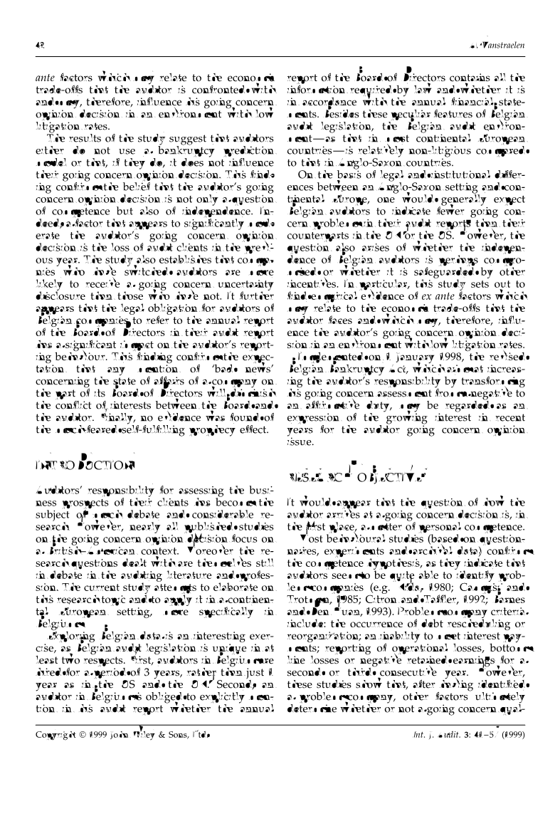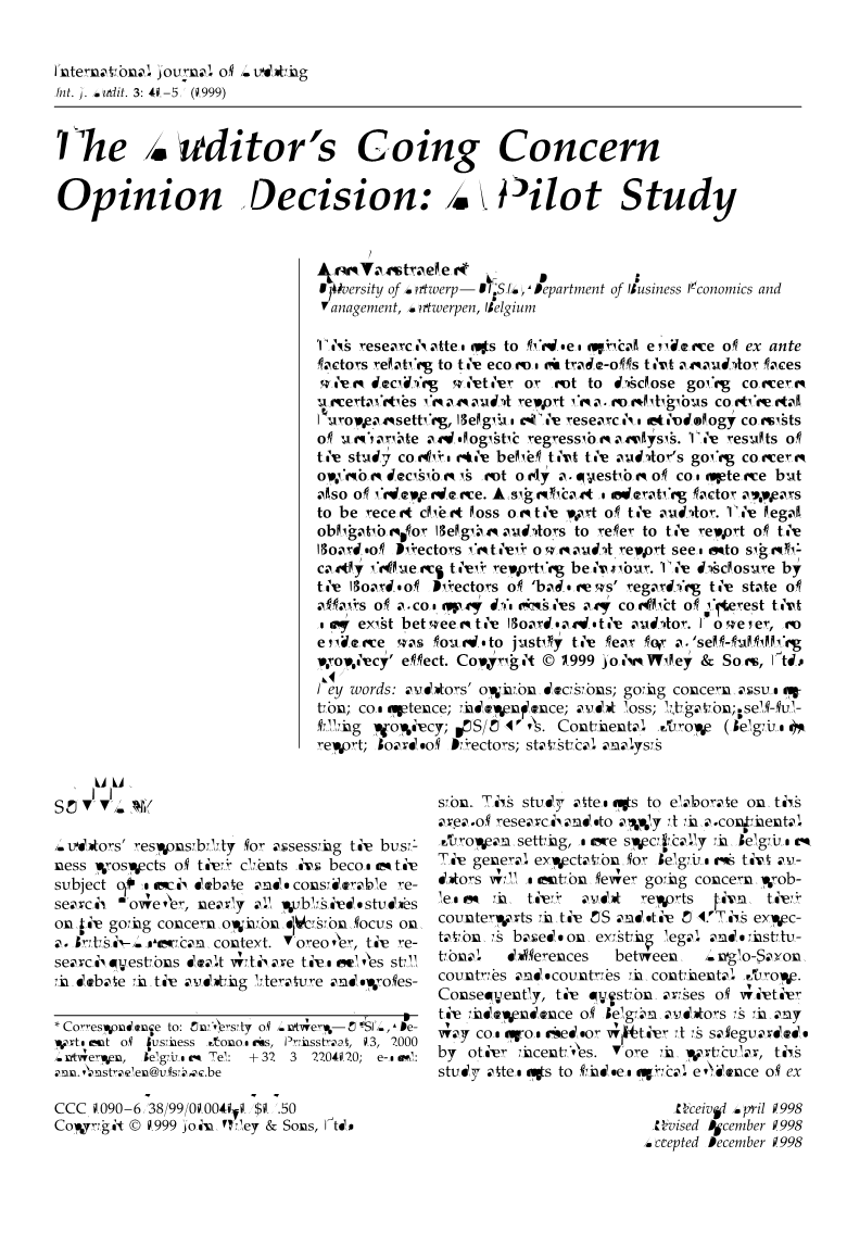 关键词:审计意见决策;持续经营假设的方法;能力;独立性;审计损失;诉讼;实现自我的预言;美国/英国与欧洲大陆(比利时);报告;董事会;统计分析。