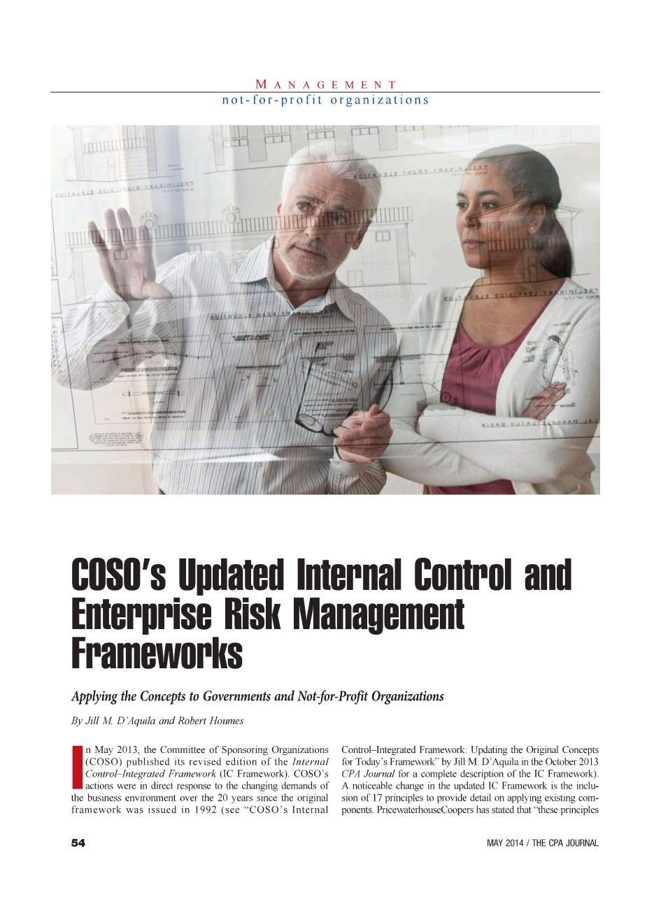 2013年5月, COSO发布了修正版本的内部控制集成框架。这一举动是对自1992年发行的原始框架以来商业环境需求变化的直接反应。从COSO的内部控制集成框架来看,Jill M.Drsquo; Aquila 为了现在的框架更新了原始概念,在2013年10月的CPA杂志上对内部控制框架做了完整的描述。新内部控制框架的一个明显改变是为应用存在的组件提供细节的17条原则的阐述上。Price Waterhouse Coopers 声明这些原则与很多团体相关,像公营、私营、非盈利组织。据说,社区商业正在关注新的COSO框架,政府和非盈利组织也在关注它。