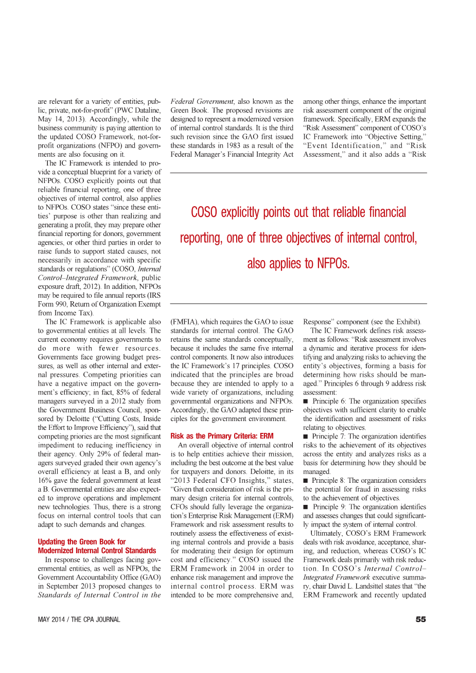 为了响应政府和非盈利组织面临的挑战,政府问责办公室于2013年9月提倡了一些在联邦政府中关于内部控制标准的改变,即绿皮书。建议的修订本体现了一个内部控制标准的现代化视角。自从政府问责办公室因联邦管理者金融诚信行为而于1983年第一次发布的标准以来,它是第三次修订。因它由相同的5个内部控制要素构成,政府问责办公室从概念上保存了相同的标准。它也介绍了内部控制集成框架的17条准则。COSO指出这些原则是广泛的因其适用于广大组织,包括政府性组织和非盈利组织。因此,政府问责办公室使用这些原则来适应政府环境。