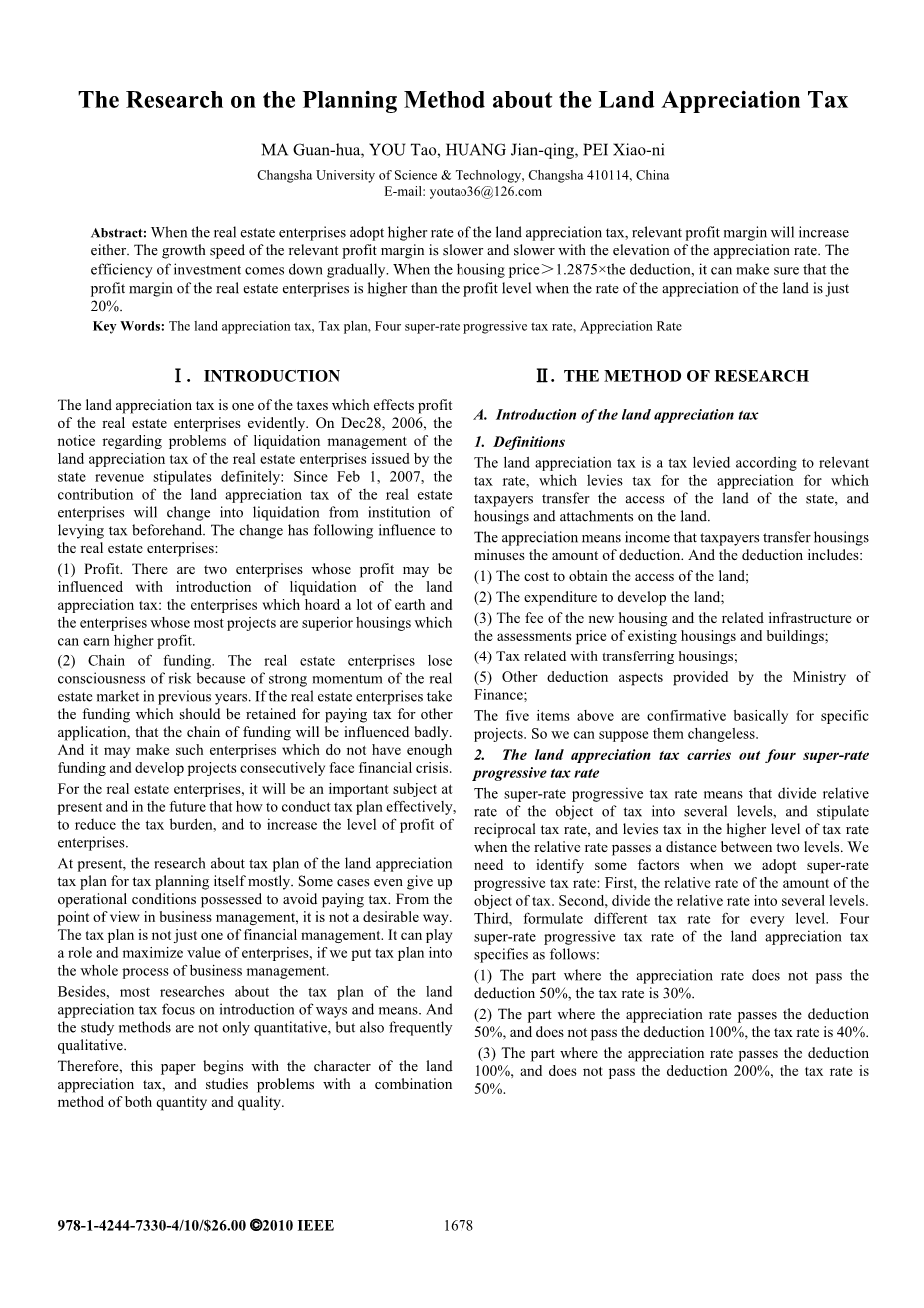而且,这篇论文以土地增值税的特点开始,并且用定量和定性相结合的方法研究问题。