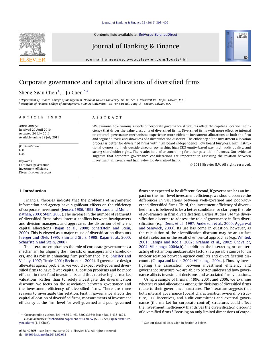 大量的越来越多的文献仔细调查了公司治理与公司价值/多元化。我们的研究为这些文献做出了两个有价值的贡献,首先,迄今为止,没有有关数据的研究表明公司治理结构如何影响导致公司价值折扣的无效的资本分配,我们的研究试图去弥补这条沟渠。第二,之前的很多研究用小部分的治理变量来研究如何影响公司价值以及公司的多样化折扣。与这些可能忽略其他重要的治理维度造成遗漏变量的研究不同,我们用了大量的治理变量,包括内部和外部。因此,本文研究的结果有助于更好地理解公司治理结构的多个方面如何决定投资分配和多样化公司的价值。