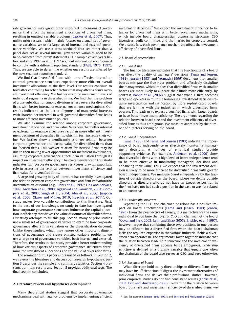 该文献强调了公司治理作为一种机制在协调股东与管理者利益以及在提高公司绩效中的作用( Shleifer and Vishny, 1997; Tirole, 2001; Becht et al., 2002)。如果治理设计能够缓解代理问题,我们应该期待治理好的公司有着较少的资本配置问题,在基金投资上更有效,有着更高的市场价值。我们关注于公司治理与投资效率之间的联系而不是仅仅考虑公司的价值降低。研究这一相关性的原因有以下三点,首先,如果治理因素影响公司的资本分配,在公司层面上衡量治理好或者不好的因素是不同的;第二,如果公司治理对公司的投资效率有影响,治理好的公司与治理不好的公司在价值方面是不同的;第三,公司的投资效率被认为是一个更好的候选因素来证明公司治理的作用。早期的研究用多种多元化折价来确定公司治理的作用。它的使用已经出现了问题,然而,多元化折价的计算可能是数据选择的工具或是经验方法的总结。另外,不可观测因素之间的相互作用或者抵消效果对于代理冲突和多元化折价之间尚不明晰的关系来说是一个可能的来源(Campa and Kedia, 2002; Villalonga, 2004a)。因此,通过调查投资效率与治理结果之间的关系,我们能够更好地理解公司治理是怎样影响投资决定及相关的公司价值问题。