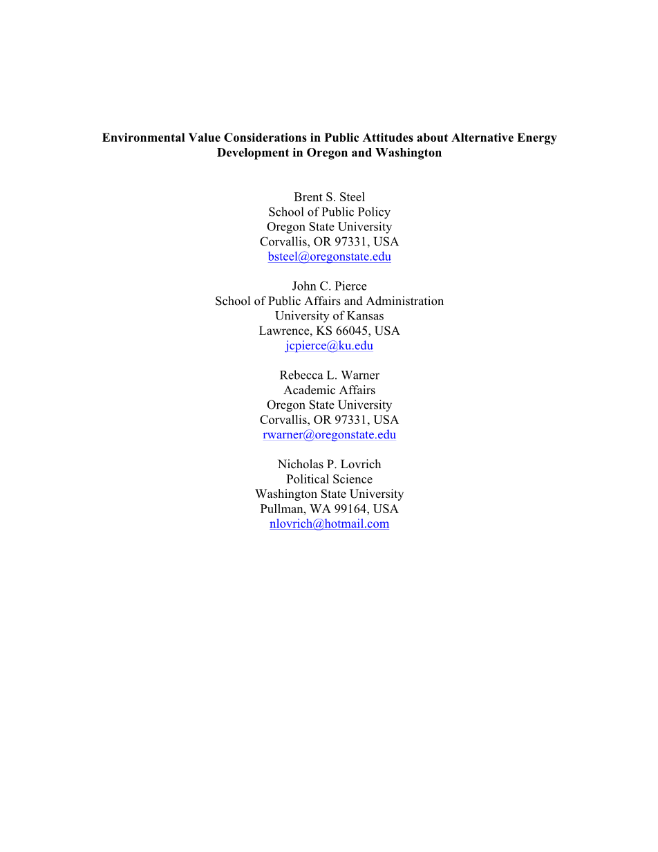 本研究探讨了环境价值取向(以及其他因素)如何影响个人对政府政策的支持或反对,这些政策旨在促进俄勒冈州和华盛顿州的生物能源,风能,地热能,太阳能和波浪能等各种可再生能源资源。价值观被定义为个人对适当的行动方案或事件结果持有的一般偏好(Heberlein 2012)。价值观被视为个人对公共政策(例如可再生能源)的态度以及相关行为(例如,在自己家中安装太阳能电池板)(Kahle,1983)。当人们从周围环境中获取信息时,价值观被用来构建适当的态度和行为(Homer and Kahle,1988)。