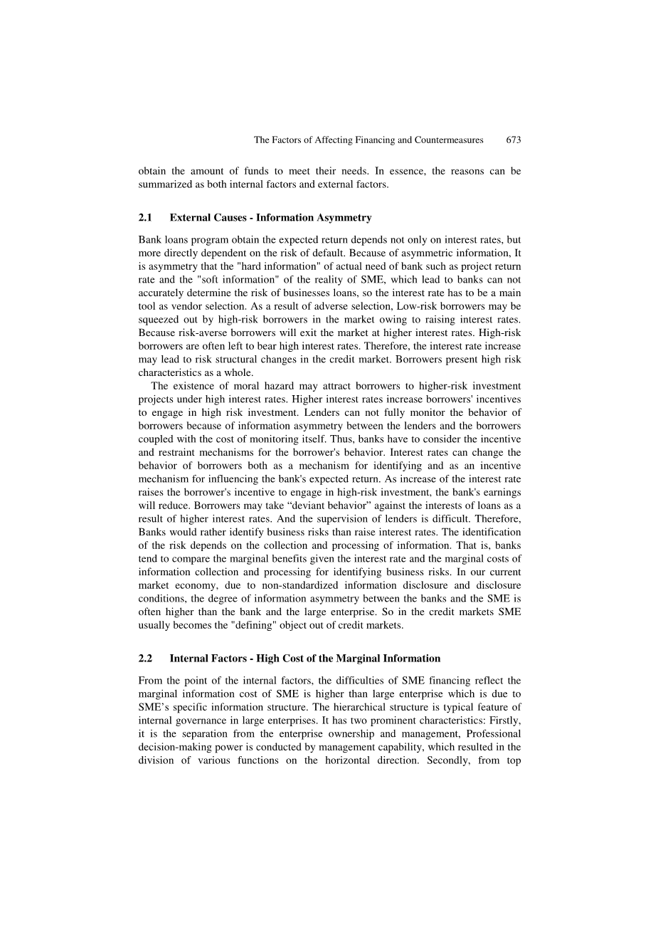 道德风险的存在,可能会吸引借款人在高利率下进行风险较高的投资项目。较高的利率提高了借款人的激励机制,从而从事高风险的投资。由于贷款人和借款人之间信息不对称,加上监控本身的成本,贷款人不能充分监控借款人的行为。因此,银行必须考虑借款人的行为的激励和约束机制。利率可以改变借款人的行为,既作为识别的机制,又作为影响了银行的预期收益的机制。由于利率的升高提升了借款人的积极性去从事高风险的投资,银行的盈利将减少。作为高利率的结果,借款人可采取“越轨行为”去反对贷款利益。同时对贷款人的监督是困难的。因此,银行宁愿确定业务的风险而不是提高利率。风险的识别取决于信息的收集和处理。也就是说,银行倾向于比较给定利率的边际效益和信息收集及处理的边际成本来识别经营风险。在我国目前的市场经济中,由于不规范的信息披露和披露条件,银行与中小企业之间的信息不对称程度往往高于银行和大型企业。因此,在信贷市场中,中小企业通常成为信贷市场的“决定性”对象。
