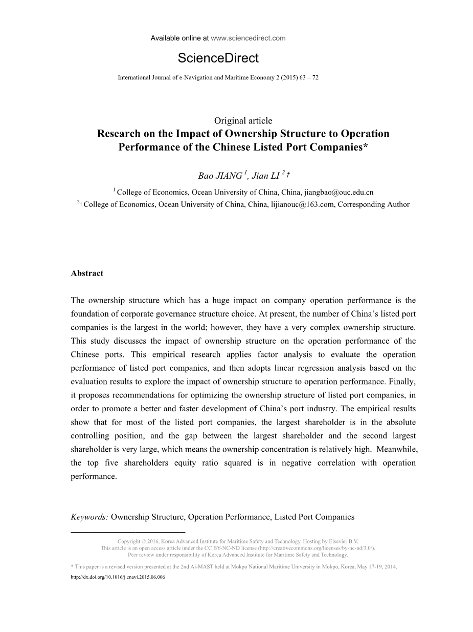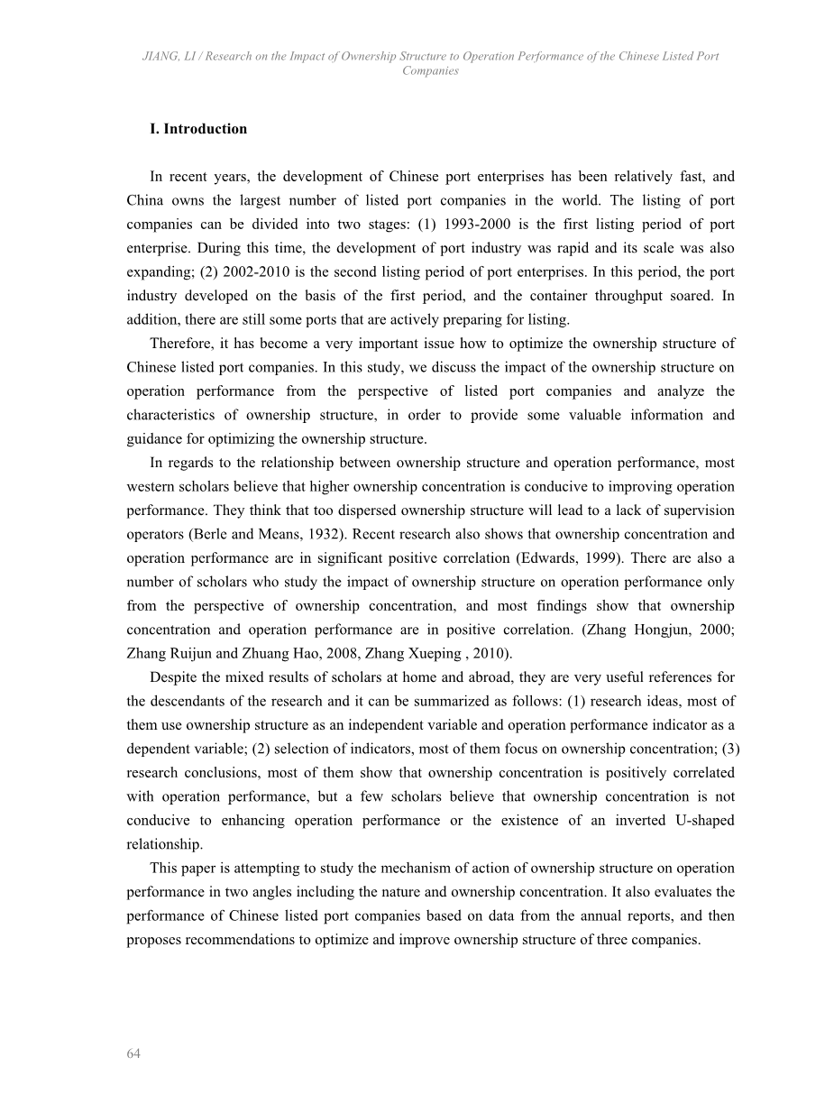 关键词:股权结构,运营绩效,上市港口公司