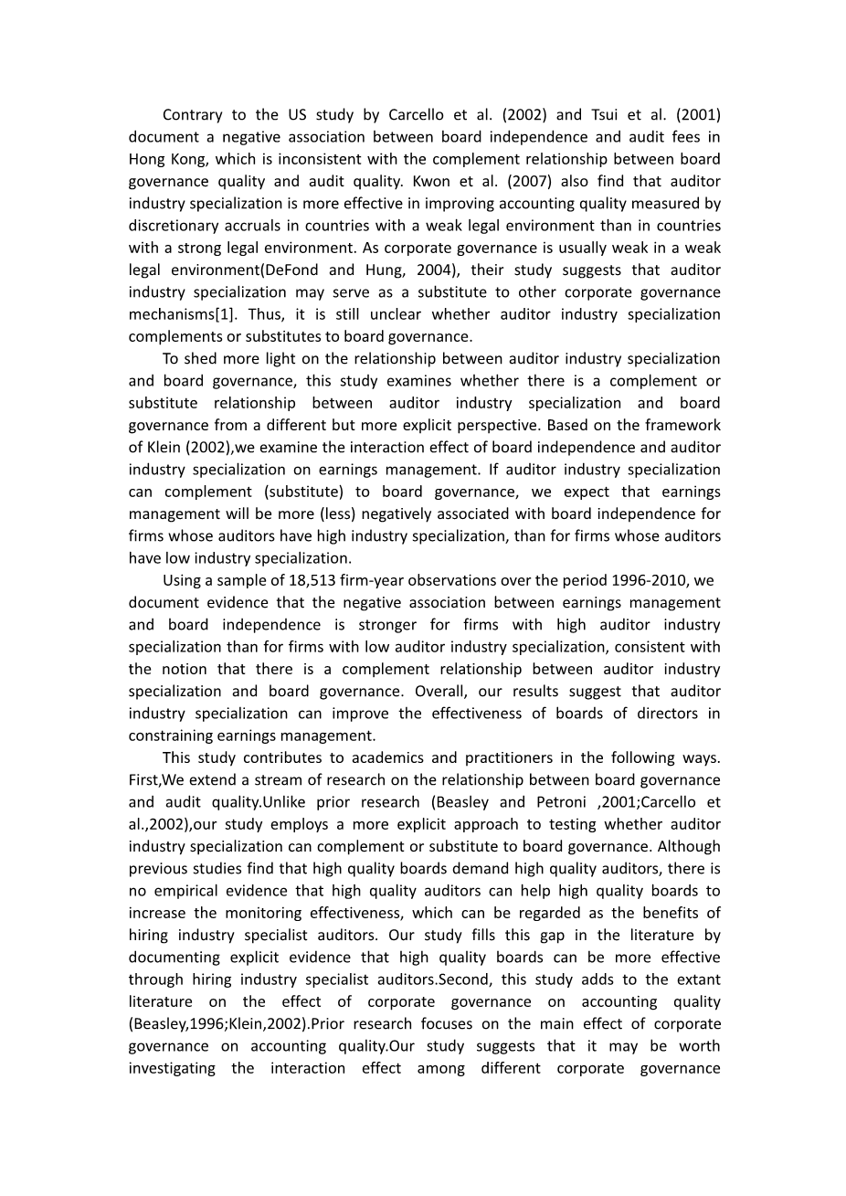 Contrary to the US study by Carcello et al. (2002) and Tsui et al. (2001) document a negative association between board independence and audit fees in Hong Kong, which is inconsistent with the complement relationship between board governance quality and audit quality. Kwon et al. (2007) also find that auditor industry specialization is more effective in improving accounting quality measured by discretionary accruals in countries with a weak legal environment than in countries with a strong legal environment. As corporate governance is usually weak in a weak legal environment(DeFond and Hung, 2004), their study suggests that auditor industry specialization may serve as a substitute to other corporate governance mechanisms[1]. Thus, it is still unclear whether auditor industry specialization complements or substitutes to board governance.