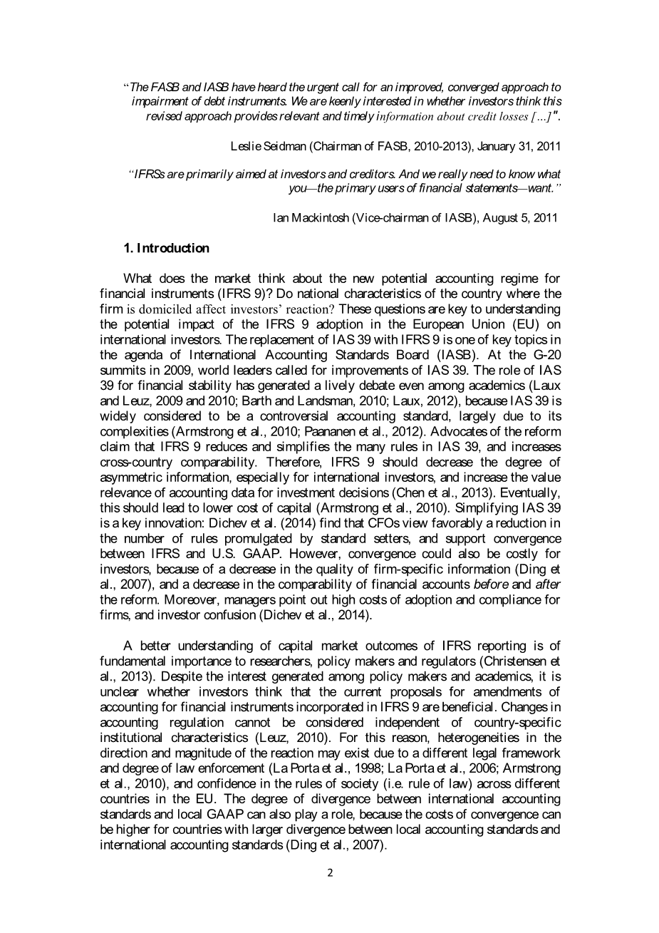 市场如何看待新的潜在的金融工具会计制度(IFRS 9)?公司所在国的民族特征是否会影响投资者的反应?这些问题对于理解欧盟采用IFRS 9对国际投资者的潜在影响至关重要。以IFRS 9取代IAS39是国际会计准则理事会(IASB)议程上的关键议题之一。在2009年的20国集团峰会上,世界各国领导人呼吁改进国际会计准则第39号。IAS 39对金融稳定的作用甚至在学术界也引发了激烈的争论(Laux和Leuz, 2009年和2010年;巴斯和兰德斯曼,2010;因为IAS39被广泛认为是一个有争议的会计准则,很大程度上是因为它的复杂性(Armstrong et al., 2010;Paananen等,2012)。改革的倡导者声称,IFRS 9减少和简化了IAS 39中的许多规则,并提高了跨国可比性。因此,IFRS 9可以降低信息不对称的程度,尤其是对国际投资者而言,可以增加会计数据对投资决策的价值相关性(Chen et al., 2013)。最终,这将导致更低的资本成本(Armstrong等,2010)。简化IAS 39是一项关键创新:Dichev等人(2014)发现,首席财务官赞同减少标准制定者颁布的规则数量,并支持IFRS与美国公认会计准则(GAAP)之间的趋同。然而,由于企业特定信息质量的下降(Ding et al., 2007),以及改革前后金融账户可比性的下降,对投资者来说,趋同也可能是昂贵的。此外,管理人员指出,企业采用合规的成本很高,投资者感到十分困惑(Dichev et al., 2014)。