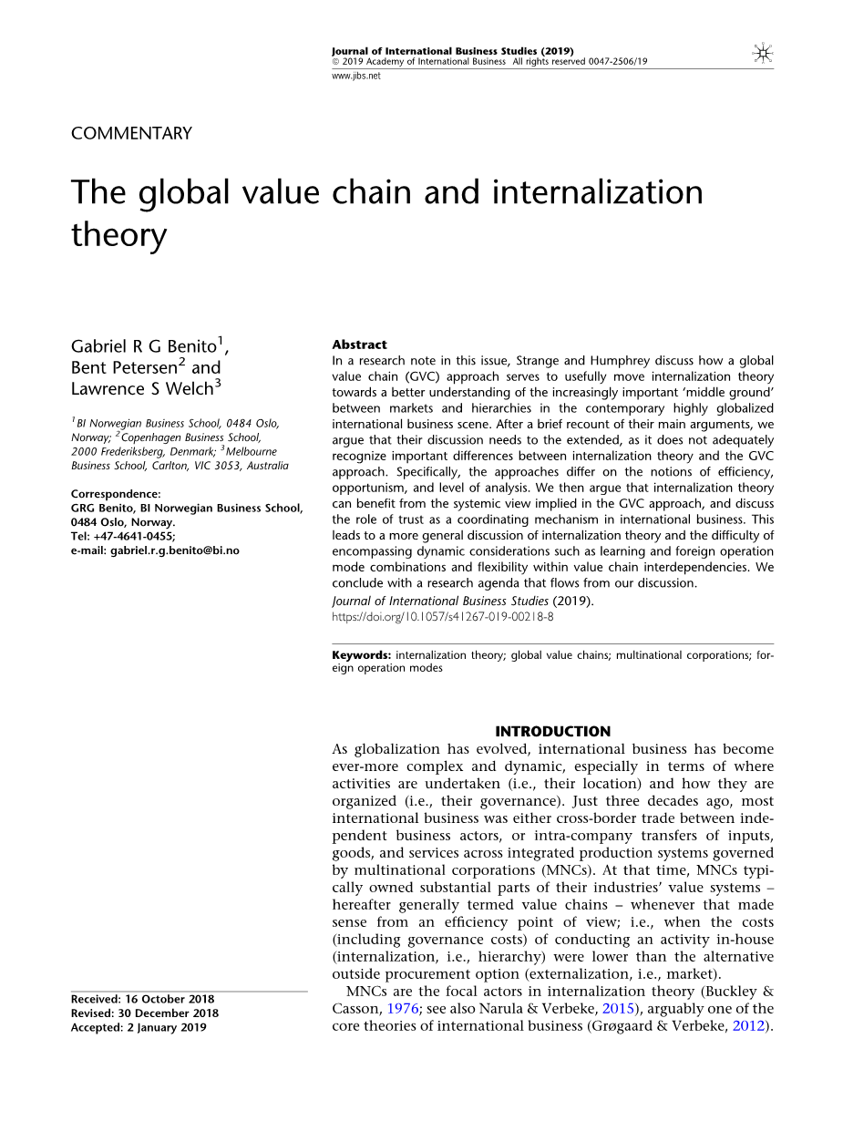 在本期的研究报告中,Strange和Humphrey讨论了全球价值链(GVC)方法如何有效地推动内部化理论更好地理解当今高度全球化的国际商业环境中市场和等级之间日益重要的“中间地带”。在简要叙述了他们的主要论点之后,我们认为他们的讨论需要扩展,因为它没有充分认识到内部化理论和全球价值链方法之间的重要区别。具体来说,这些方法在效率、机会主义和分析水平等概念上有所不同。然后,我们认为,内部化理论可以从全球价值链方法所隐含的系统性观点中获益,并讨论了信任作为一种协调机制在国际商务中的作用。这导致了对内部化理论的更为普遍的讨论,以及包含动态因素(如学习和国外运营模式组合)的困难,以及价值链相关性中的灵活性。最后,我们从讨论中得出一个研究议程。国际商业研究杂志(2019年)。