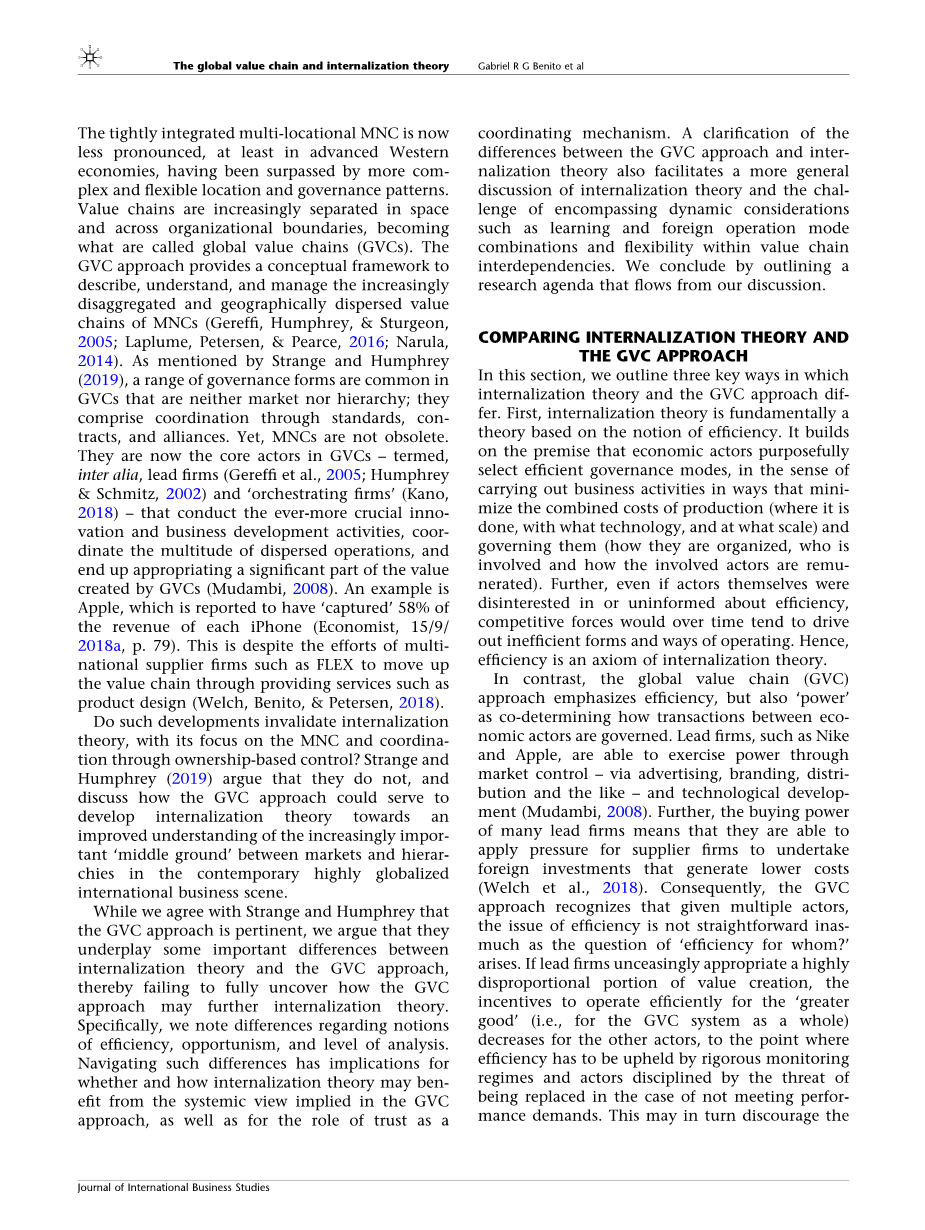 随着全球化的发展,国际业务变得越来越复杂和动态,特别是在活动地点(即其所在地)和组织方式(即其治理)方面。就在30年前,大多数国际业务要么是独立业务参与者之间的跨境贸易,要么是跨国公司(跨国公司)管理的综合生产系统内部的投入、货物和服务转移。当时,跨国公司通常拥有其行业价值体系的重要组成部分(以下简称价值链),无论何时从效率的角度来看,这都是合理的;也就是说,开展内部活动(内部化,即层级)的成本(包括治理成本)低于其他组织机构的成本(包括治理成本)。Tside采购选择权(外部化,即市场)。跨国公司是内部化理论的主要参与者(Buckleyamp;Casson,1976;另见Narulaamp;Verbeke,2015),可以说是国际商业的核心理论之一(Gr_Gaardamp;Verbeke,2012)。紧密结合的多地点跨国公司现在不那么明显,至少在西方发达经济体中,已经被更复杂和灵活的位置和治理模式所超越。价值链在空间和跨组织边界上日益分离,成为所谓的全球价值链。全球价值链方法提供了一个概念框架描述、理解和管理日益分散和地理分散的价值跨国公司链(Gereffi、Humphrey和Sturgeon,2005年;Laplume、Petersen和Pearce,2016年;Narula,2014)正如Strange和Humphrey(2019)所提到的,在既不是市场也不是层次结构的全球价值链;它们包括通过标准、合同和以及联盟。然而,跨国公司并没有过时。他们现在是全球价值链的核心参与者,尤其是被称为领导公司(Gereffi等人,2005年;Humphreyamp;Schmitz,2002年)和“协调公司”(Kano,2018年),他们开展越来越重要的创新和业务发展活动,协调分散的多个运营,最终获得价值链的重要部分。由全球价值链(GVCS)创建的Ue(Mudambi,2008年)。苹果就是一个例子,据报道它已经“占领”了每部iPhone 58%的收入(经济学家,15/9/2018a,第79页)。这与跨国公司的努力无关通过提供产品设计等服务(Welch、Benito和Petersen,2018年),Flex等供应商公司将向价值链上游移动。这样的发展是否会使内部化理论失效,其重点在于跨国公司,并通过基于所有权的控制进行协调?Strange和Humphrey(2019)认为他们没有,并讨论了全球价值链方法如何有助于发展内部化理论,以更好地理解当代高度全球化的国际商业环境中市场和等级之间日益重要的“中间地带”。虽然我们同意汉弗莱的观点,认为全球价值中心方法是有针对性的,但我们认为,他们低估了内部化理论和全球价值中心方法之间的一些重要区别,从而未能充分揭示全球价值中心方法如何进一步内部化理论。具体来说,我们注意到效率、机会主义和分析水平的概念存在差异。把握这些差异对于内在化理论是否以及如何从全球价值中心方法所隐含的系统观点中获益,以及信任作为协调机制的作用具有重要意义。澄清全球价值链方法和内部化理论之间的差异也有助于更广泛地讨论内部化理论,以及包含动态因素(如学习和国外运营模式组合)和价值链相互依赖性内的灵活性)的挑战。最后,我们概述了我们讨论的研究议程。