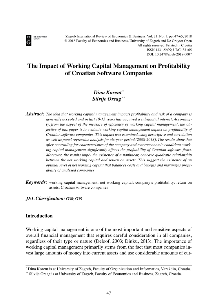 关键词:营运资金管理,净营运资本,企业盈利能力,资产回报率,克罗地亚软件公司