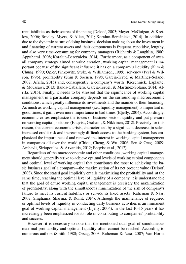 最初对这一主题的研究假定这些概念之间存在线性关系,并为其意义提供强有力的统计支持。由于营运资金管理的方式会影响到公司的盈利能力,这些研究可以分为两组:那些数量较多的一组指出了营运资金管理的负面影响并且支持激进的营运资金管理策略,而另一组指出了流动资金管理对企业的盈利能力和成功与否的积极作用,并且支持保守的管理策略。