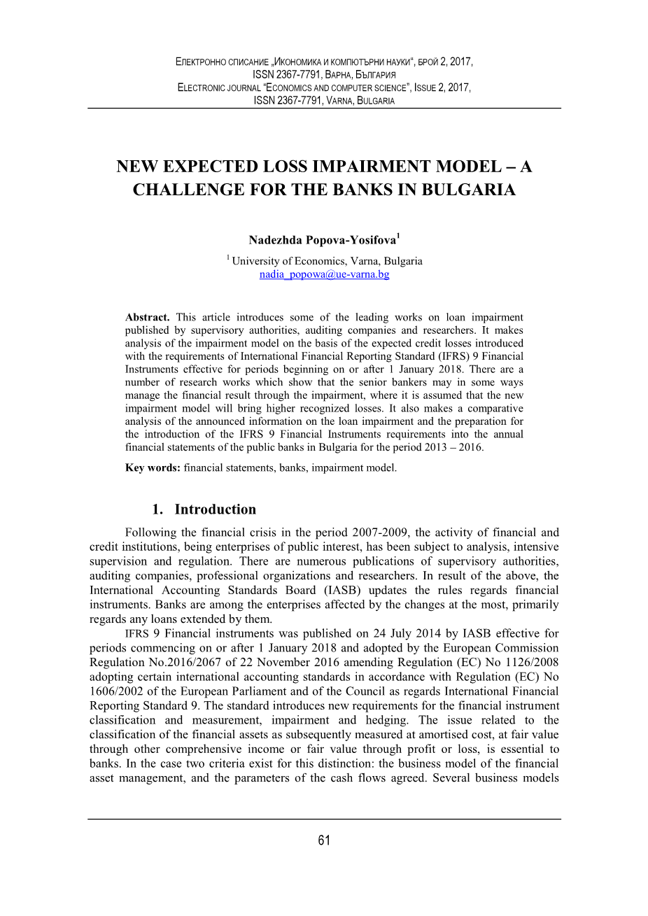 摘要:本文介绍了监管机构、审计公司和研究人员发表的一些关于贷款减值的主要著作,根据《国际财务报告准则》(IFRS)9号金融工具,对2018年1月1日起或以后有效期间的预期信用损失引入的损失模型进行分析。有大量研究工作表明,高级银行家可能在某些方面通过减值管理财务结果,其中假设新的减值模型会带来更高高的确认损失。本文也对已公布的关于贷款减值的信息以及为在保加利亚上市银行2013-2016年年度财务报表中引入IFRS9号金融工具要求所做的准备工作进行了对比分析。
