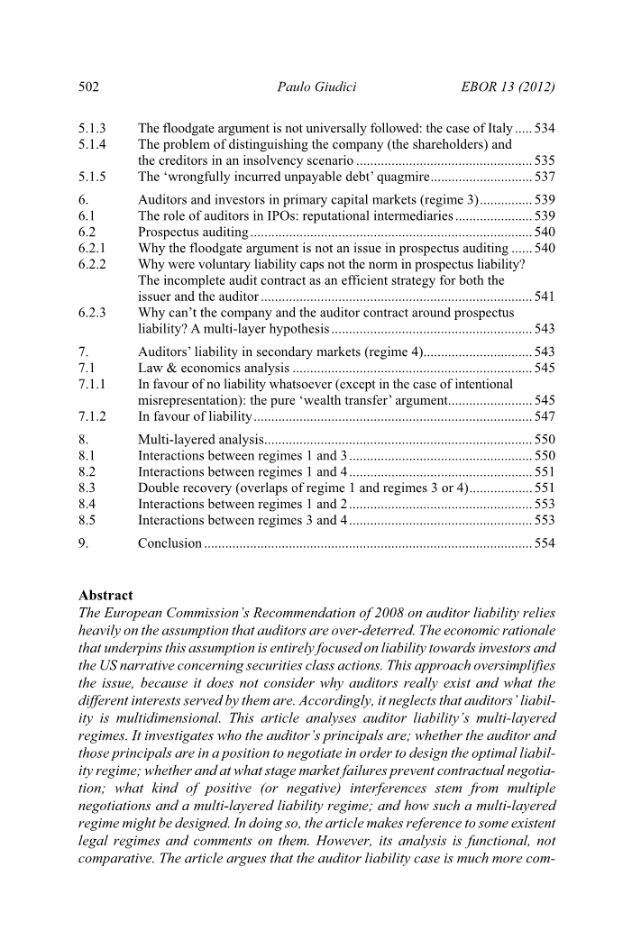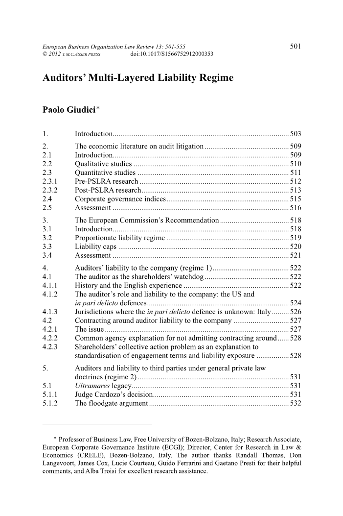 据我所知,这是国际上关于审计责任的文献中第一篇全面分析和讨论审计责任的多层次制度的文章。我处理审计员所服务的不同利益集团,并考虑适用于每一层的不同法律策略。然后阐述了在设计最优多层体系时必须考虑的一些问题,并讨论了不同的政策选择。在此过程中,我参考了一些现存的法律制度,并对其进行了评述。特别地,我认为美国的法律制度是经济学家和律师经济学家的参考点,他们研究责任问题和影响政策。我还考虑了欧洲法律和经济学专家经常提到的英国制度,以及意大利制度,在许多审计责任问题上,意大利制度与美国和英国制度有很大的不同。然而,我的分析是功能性的,而不是比较性的。我认为,审计师的责任案例比经济学和法律与经济学文献所建议和得出的结论要复杂得多,即全球范围内支持减少责任的普遍、统一的方法没有科学依据,至少在我们目前所知的阶段是如此。我的推论是,2008年欧共体的建议是糟糕的政策,必须被遗忘。