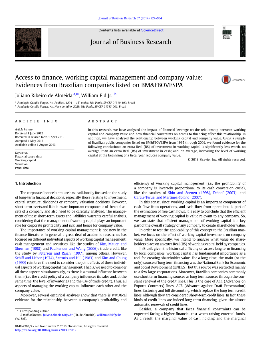 融资渠道、营运资金管理和公司价值:基于巴西证券交易所上市公司的实证研究