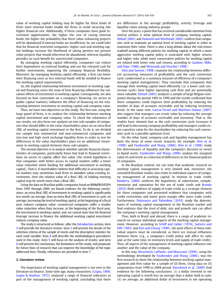 在巴西的背景下,我们可以说关于营运资金管理的学术研究是非常有限的,而且咨询的研究也涉及到公司营运资金管理的各个方面。在贸易信贷研究中Bandeira(2008)证实了假设的替换、互补性和声誉使用贸易信贷,Brando(2010)的发现证实对于那些商业贸易公司,贸易信贷供应作为一个战略元素,同时提出证据表明公司信贷限制和降低毛利率提供更多的贸易信贷。此外,Nakamura和Palombini(2010)研究了巴西市场中营运资本管理的决定因素,发现债务水平、规模和增长率会影响公司营运资本管理。