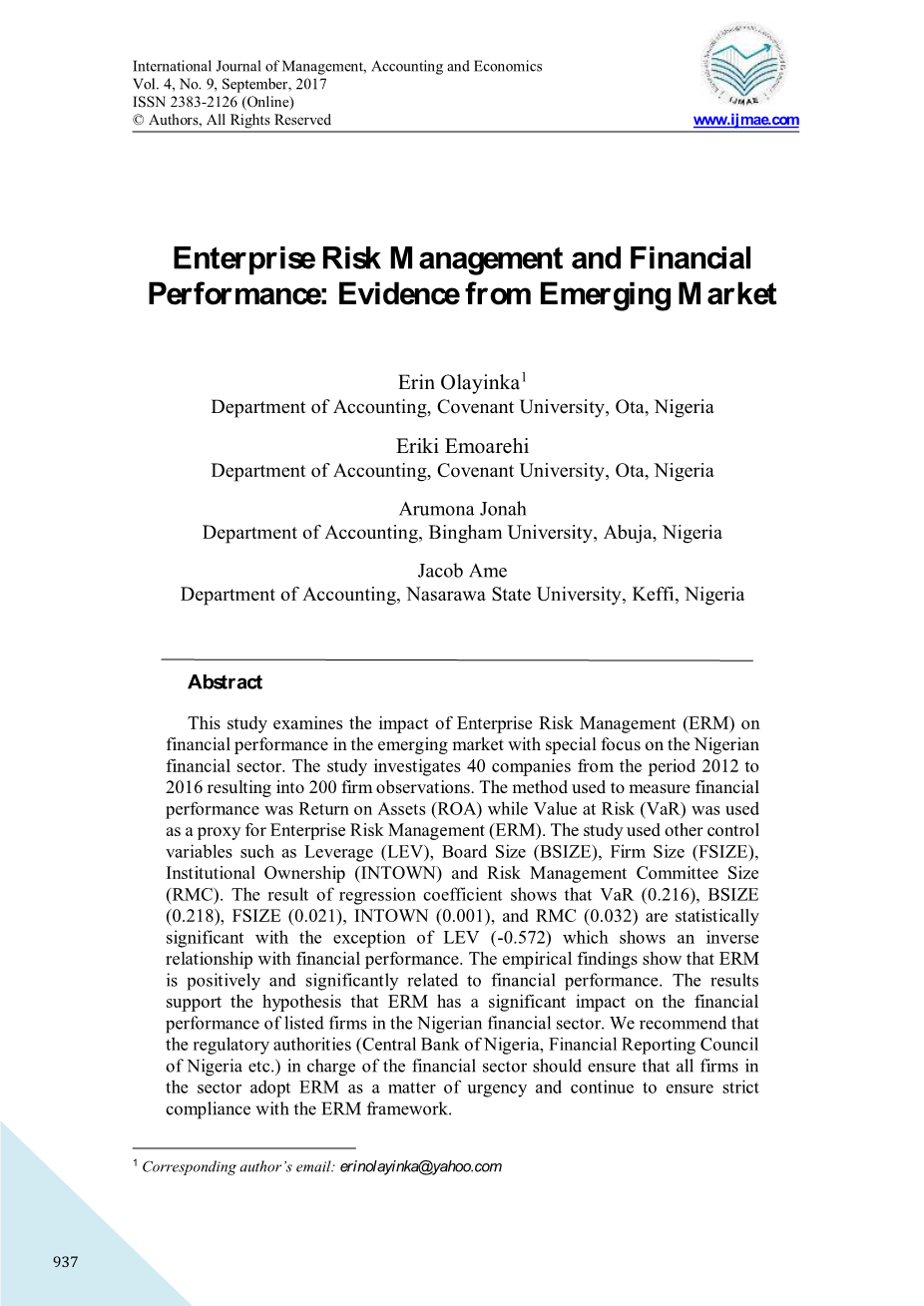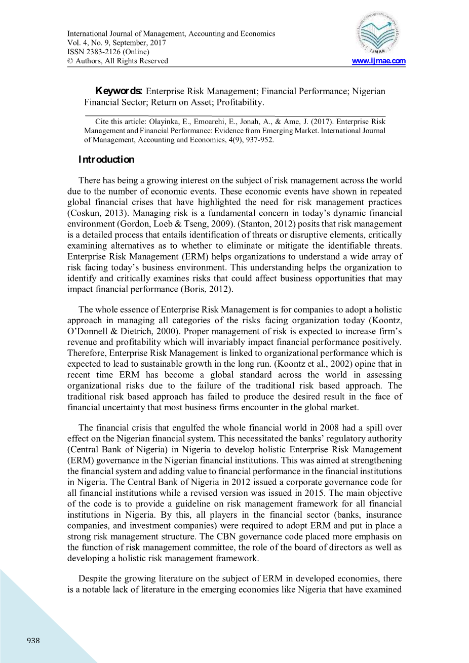 关键词: 企业风险管理;财务绩效;尼日利亚金融部门;资产回报率;盈利能力。