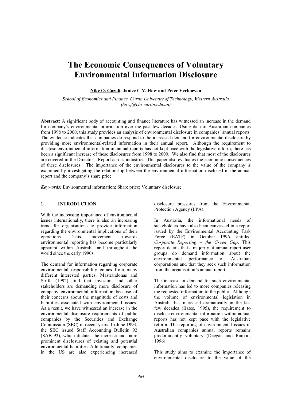 摘要:过去几十年来,大量的会计和金融文献见证了公司环境信息需求的增长。本研究使用了1998年至2000年间澳大利亚公司的数据,对公司年度报告中的环境信息披露进行了分析。证据表明,公司通过在年度报告中提供更多与环境相关的信息,确实对要求环境信息披露的增加采取了措施。虽然年度报告中披露环境信息的要求跟不上立法改革的步伐,但从1998年到2000年,这些披露的数量大幅增加。我们还发现大多数披露都在各行业的董事会报告中有所涉及。本文还评估了这些披露的经济后果。通过调查年度报告中披露的环境信息与公司股价之间的关系,研究了环境信息披露对公司价值的重要性。