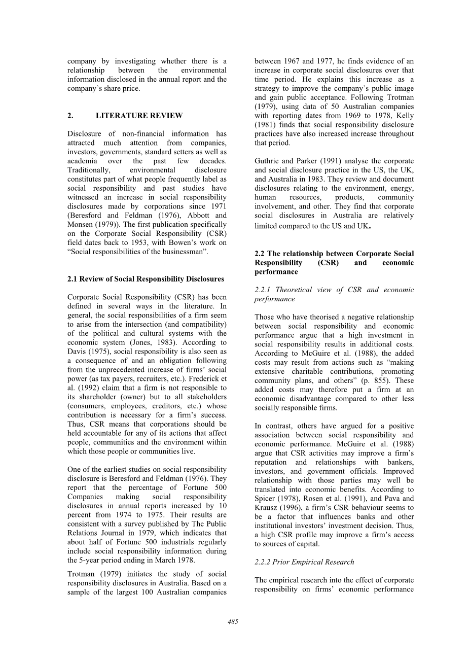企业责任对企业经济绩效影响的实证研究产生了不同的结果。 Belkaoui(1976)调查了污染控制披露的信息内容。他的结果表明经济绩效与社会责任之间存在正相关关系。其他研究产生的结果与企业责任活动对金融市场的影响一致(Anderson和Frankle1980Shane和Spicer1983)。