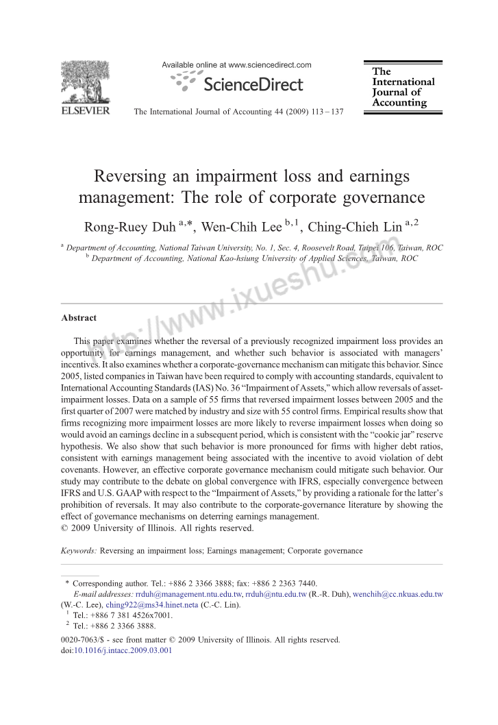 本研究旨在探讨台湾上市公司是否将资产减值损失转为盈余管理。我们选择台湾上市公司有两个原因。首先,台湾采用了大陆法系。其次,自2005年以来,台湾上市公司一直被要求遵守台湾《财务会计准则》第35号,相当于国际会计准则第36号“资产减值”。' 55家在2005年至2007年第一季期间收回减值损失的公司的样本数据,与55家控股(无逆转)公司的行业和规模相匹配。在进行分析时,我们使用减值损失逆转,而不是可自由支配的应计利润(Dechow, Sloan,amp; Sweeney, 1995;Holthausen, Larcker,amp; Sloan, 1995),用于识别盈余管理,因为前者属于可观察和明确的交易,可以明显增加净收入,而后者是一个综合衡量指标(Healy amp; Wahlen, 1999;Libby amp; Kinney, 2000: 384)。此外,关注特定财务报告标准的实施,可以帮助决策者更清楚地得出政策含义,也可以帮助公司董事会成员或审计委员会成员识别会计问题,以便进行特别审查。结果表明,在出现反转前盈利下降的时期,确认减值损失的公司往往会随后逆转减值损失,这与“饼干罐”储备假说相符。这种行为在负债率较高的公司更为明显,这与盈余管理与避免违反债务合同的动机相关联。我们进一步发现,一个有效的公司治理机制将减轻上述盈余管理行为。