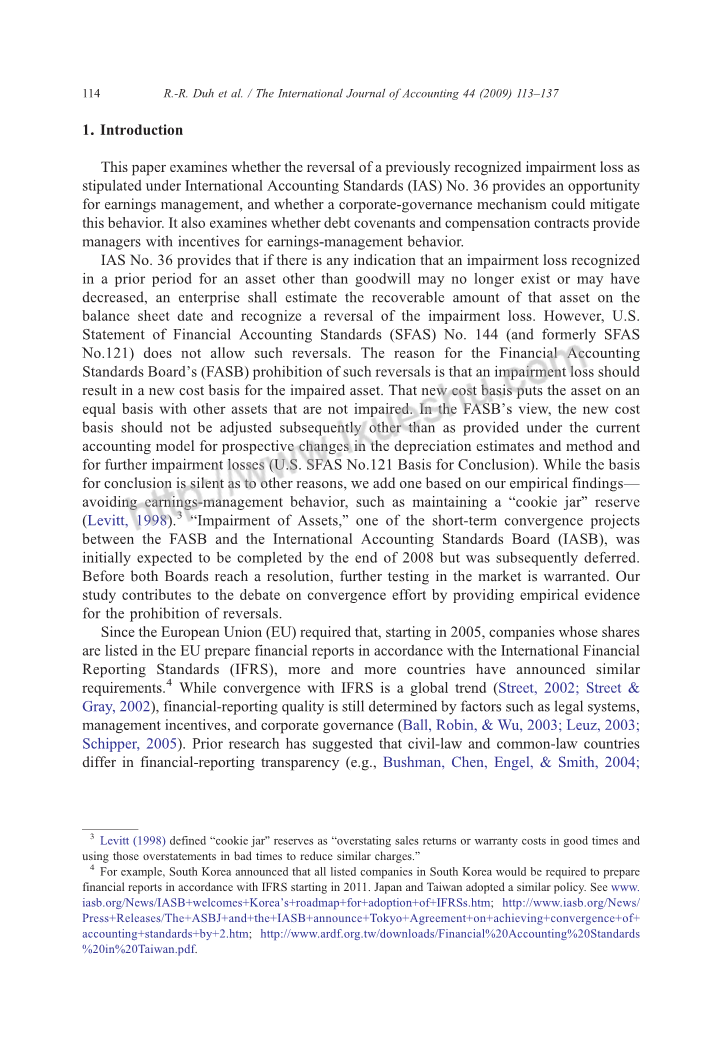 IAS 36号提供,如果有任何迹象表明前期的减值损失确认为商誉以外的资产可能不再存在或可能减少,企业应当估计资产的可收回金额在资产负债表日和识别减值损失的逆转。然而,美国财务会计准则声明第144号(前财务会计准则第121号)不允许这种逆转。财务会计准则委员会(FASB)禁止这种逆转的原因是,减值损失应导致受损资产的新成本基础。新的成本基础使资产与其他没有受损的资产处于平等的基础上。财务会计准则委员会认为,新的成本基础不应在以后进行调整,除非按照现行会计模型,对折旧估计和方法的预期变化以及进一步的减值损失进行调整(美国财务会计准则第121号结论基础)。虽然结论的基础对于其他原因是沉默的,我们增加了一个基于我们的经验发现-避免收入管理行为,如保持一个“饼干罐”储备(Levitt, 1998)。“资产减值”是FASB和国际会计准则委员会(IASB)之间的短期合并项目之一,最初预计在2008年底前完成,但后来被推迟。在两家公司的董事会达成决议之前,有必要在市场上进行进一步的测试。我们的研究为禁止反转提供了经验证据,为关于收敛努力的辩论作出了贡献。