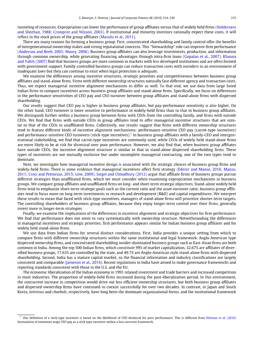 我们研究了商业集团附属公司和独立公司在激励结构、战略重点和竞争力方面的差异。拥有不同所有权结构的公司自然面临着不同的代理和交易成本。因此,我们预计管理层激励机制也会有所不同。为此,我们使用印度大型上市公司的数据来比较商业集团子公司和独立公司的激励机制。具体来说,我们关注的是集团子公司与分散所有权的独立公司在CEO薪酬和CEO更替的绩效敏感性上的差异。