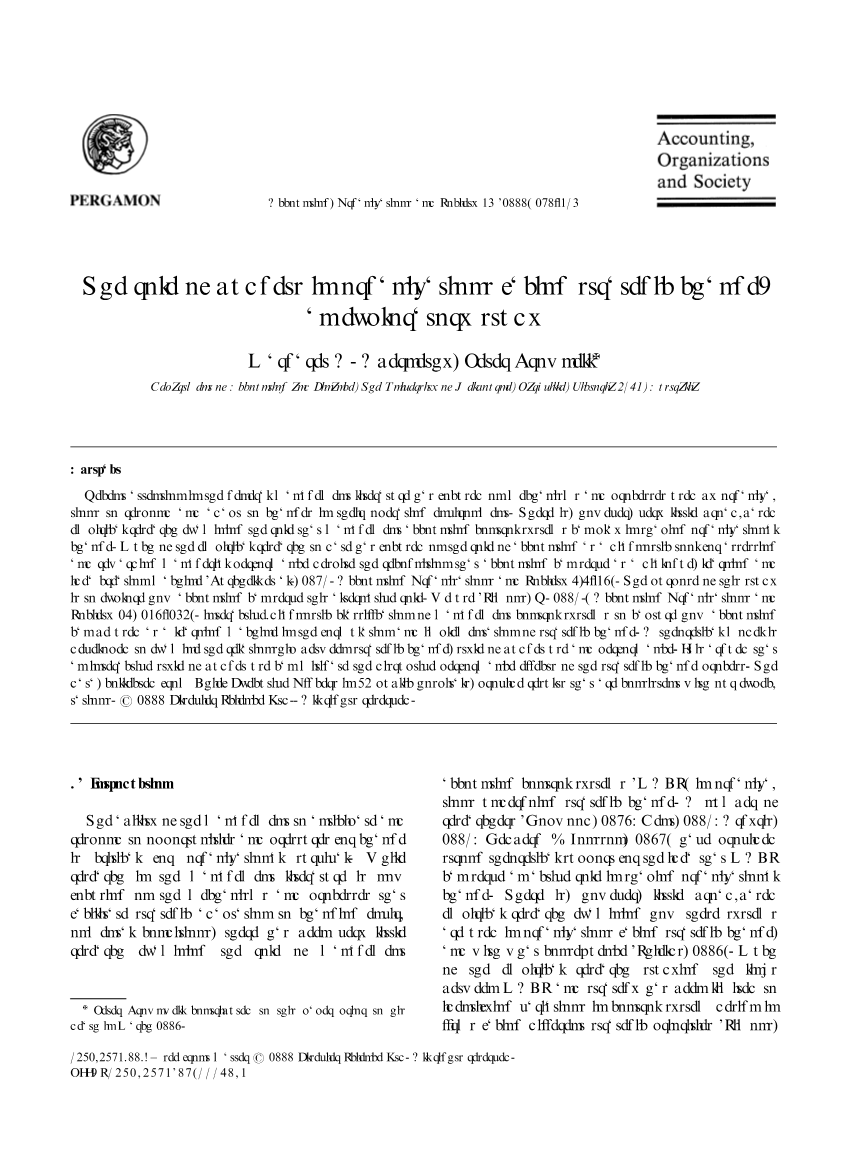 摘要:最近在一般管理文献中关注的重点是各组织为应对和适应其业务环境的变化而使用的机制和程序。然而,很少有基础广泛的实证研究探讨管理会计控制系统在组织变革中的作用。迄今为止,许多实证研究都侧重于会计作为评估和奖励管理业绩的诊断工具的作用,尽管人们认识到会计可以作为一种对话、学习和创造思想的机器(Burchell等人,1980年。会计组织与社会5,5-27)。本研究的目的是探讨会计如何发挥这一替代作用。我们使用(Simons r 1990。会计组织与社会15,127-143)管理控制系统的交互/诊断类,以了解在制定和实施战略变革时如何将会计作为学习机器。研究了战略变革、预算使用方式和绩效之间的关系。有人认为,采用互动式的预算使用方式可以减轻战略变革进程的破坏性业绩影响。这些数据是从63家公立医院的行政总裁那里收集的,结果与我们的预期一致。#1999爱思唯尔科学有限公司保留所有权利。
