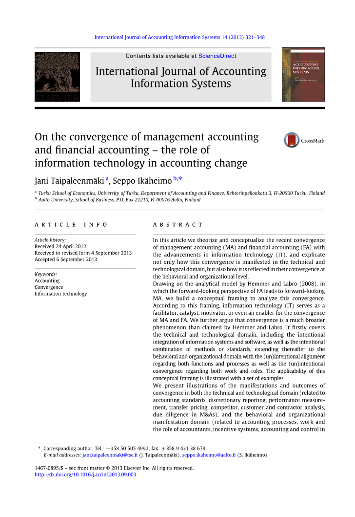 摘 要:本文在本文中,我们将管理会计(MA)和财务会计(FA)的近期趋同与信息技术(IT)的进步理论化和概念化,并且不仅阐明了这种趋同在技术和技术领域如何表现,而且它如何反映在行为和组织层面的融合中。借助于Hemmer和Labro(2008)的分析模型,其中FA的前瞻性视角导致前瞻性MA,我们构建了一个概念框架来分析这种趋同。根据这一框架,信息技术(IT)可以作为MA和FA融合的促进者,催化剂,激励者,甚至是推动者。我们进一步认为,收敛是比Hemmer和Labro所宣称的更广泛的现象。它首先涉及技术和技术领域,包括信息系统和软件的有意整合,以及方法或标准的有意结合,然后延伸到行为和组织领域,关于功能和过程的(非)有意识的一致性以及关于工作和角色的(非)故意收敛。用一组例子说明了这种概念框架的适用性。我们提供了表现形式和结果的技术和技术领域的融合(与会计准则,自由裁量报告,绩效衡量,转让定价,竞争对手,客户和承包商分析,并购中的尽职调查相关)以及行为和组织表现域(与会计流程,工作相关)会计师,激励制度,会计和控制,跨国公司,商业网络控制,董事会和风险投资家的作用。根据我们的观察,我们得出结论,前瞻性FA元素通常与MA交织在一起,反之亦然,技术和技术领域的融合似乎先于行为和组织领域的融合。在我们的大多数观察中,IT在这一融合过程中起着重要甚至至关重要的作用。根据这些趋同观察,我们为进一步研究开辟了几条途径。