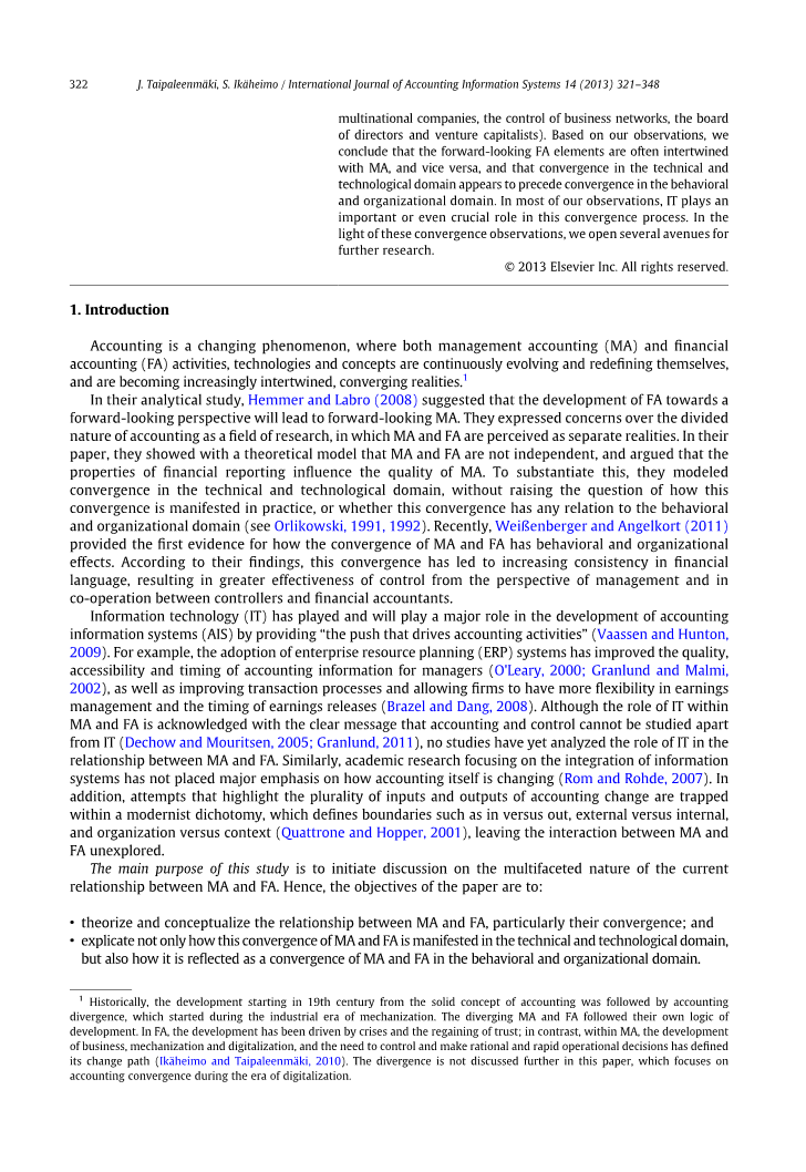 信息技术(IT)通过提供“推动会计活动的推动力”,在会计信息系统(AIS)的发展中发挥并将发挥重要作用(Vaassen和Hunton, 2009)。例如,采用企业资源规划(ERP)系统改善了管理人员的会计信息的质量,可访问性和时间安排(奥莱利, 2000年;Granlund和Malmi, 2002),以及改善交易流程,并允许公司在盈余管理和收益发布时间方面拥有更大的灵活性(Brael and Dang, 2008年)。尽管IT在MA和FA中的作用得到了认可,但明确的信息是会计和控制不能与IT分开研究(Dechow和Mouritsen,2005年;Granlund, 2011),尚未有研究分析IT在MA和FA之间关系中的作用。同样,侧重于信息系统整合的学术研究并没有强调会计本身如何变化(Rom和Rohde,2007年)。此外,强调会计变更的多个输入和输出的尝试被困在现代主义二分法中,现代主义二分法定义了边界,如外部与外部,外部与内部,组织与背景(Quattrone和Hopper,2001年),使MA和FA之间的相互作用未被探索。