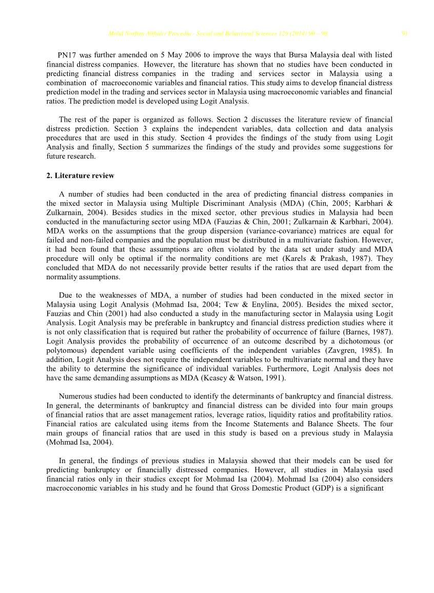 论文的其余部分组织如下。第二部分讨论了金融危机预测的文献综述。第3节解释了本研究中使用的独立变量、数据收集和数据分析程序。第4节提供了使用logit分析得出的研究结果,最后,第5节总结了研究结果,并为未来的研究提供了一些建议。