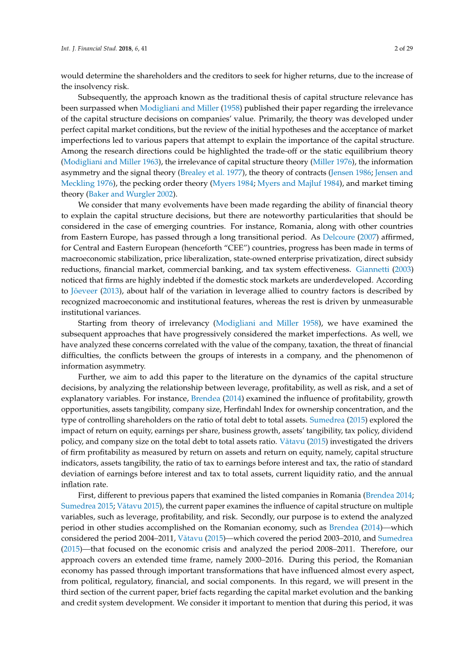 随后,当Modigliani和Miller(1958)发表关于资本结构决策与公司价值无关的论文时,超越了被称为资本结构相关性的传统论点的方法。该理论主要是在完善的资本市场条件下发展起来的,但对初始假设的回顾和对市场不完善的接受导致了各种试图解释资本结构重要性的论文。在研究方向中可以强调权衡或静态均衡理论(Modigliani和Miller 1963),资本结构理论的不相关性(Miller 1976),信息不对称和信号理论(Brealey等,1977),合同理论(Jensen 1986; Jensen and Meckling 1976),优序融资理论(Myers 1984; Myers and Majluf 1984),以及市场时机选择理论(Baker and Wurgler 2002)。