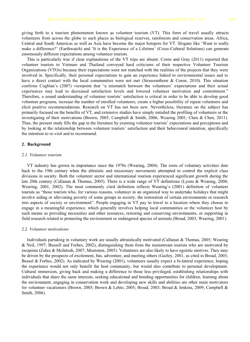 旅游业的动态变化造成了旅游者在假期中寻求目的和意义的趋势,从而产生了一种被称为“志愿旅游”的旅游现象。这种旅行方式通常会吸引来自世界各地的志愿者前往生物保护区、热带雨林和自然保护区。非洲、中美洲、南美洲以及亚洲已经成为vt的主要热点地区(地球观察)和“这是一生的经验”(跨文化解决方案)可以产生巨大不同的期望之间的志愿游客。如果对 vt 旅行缺乏清晰的解释,这一点尤其正确。Coren and gray(2011)报道,前往越南和泰国的志愿旅游者对他们各自的志愿旅游组织(vtos)表达了严厉的批评,因为他们的实际情况与他们所参与的项目不符。具体来说,他们希望获得与环境问题相关的经验和与当地社区直接接触的个人期望没有得到满足(sirasoonthorn amp; coren,2010)。这种情况证实了coghlan(2007)的观点,即“志愿者的期望与他们的实际经验不匹配,可能导致满意度下降,降低志愿者的动机和承诺。”因此,正确理解志愿者游客的满意度对于发展良好的志愿者项目、增加参与志愿者的数量、创造更高的重复参与志愿者的可能性以及获得积极的推荐至关重要。对vt的研究并不新鲜。尽管如此,关于这个主题的文献主要集中在vt的好处上,而且广泛的研究仅仅涉及到对志愿者的分析或者调查他们的动机(brown,2005;campbell amp; smith,2006; wearing,2001;chen amp; chen,2011)。因此,本研究通过考察志愿者对游客的期望和认知,以及志愿者对游客满意度与其行为意向,特别是重游意向和修正意向之间的关系,填补了文献中的空白。