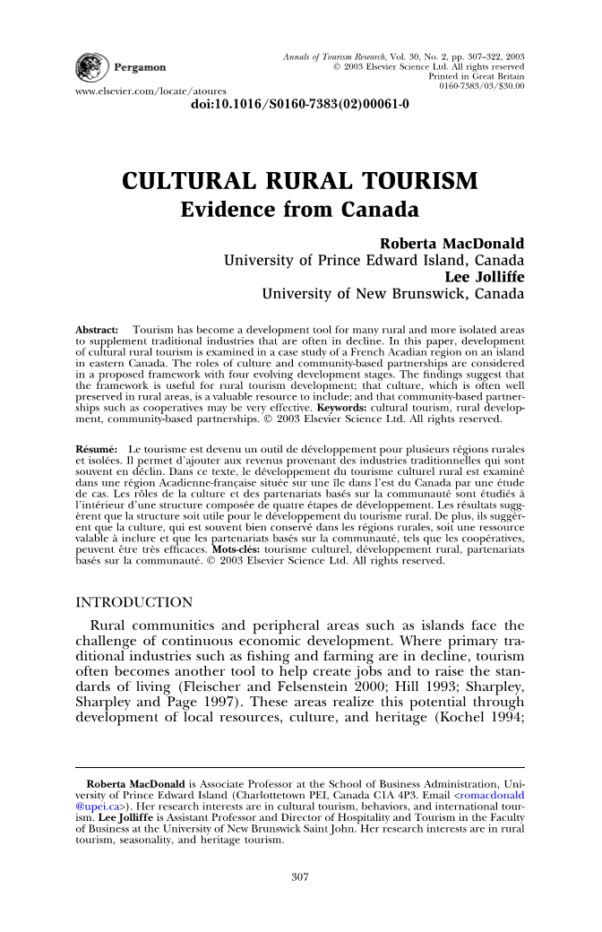 农村社区和岛屿等周边地区面临着经济持续发展的挑战。在渔业和农业等传统第一产业衰退的地方,旅游业往往成为帮助创造就业机会和提高生活水平的另一种工具(Fleischer和Felsenstein 2000;Hill 1993;Sharpley, Sharpley and Page 1997)。这些地区通过开发当地资源、文化和遗产来实现这一目的。(Kochel 1994;Lewis 1998)。这些替代资源的整合可能有助于维持和鼓励地方经济发展(Prohaska 1995)。事实上,许多游客寻求乡村旅游目的地,追求与自然环境、历史遗产和文化模式相关的愉快体验(Butler和Hall 1998;世界旅游组织,1994年)。在农村地区,这种文化和遗产恰好在几代人之间被很好地保存了下来,而在经济衰退时期,他们的居民似乎更依赖这种独特的遗产。文化和旅游成为农村和周边社区社会经济发展的资源。这在北大西洋许多小岛的文化旅游研究中也有所体现。(Jolliffe和Baum 1999)。