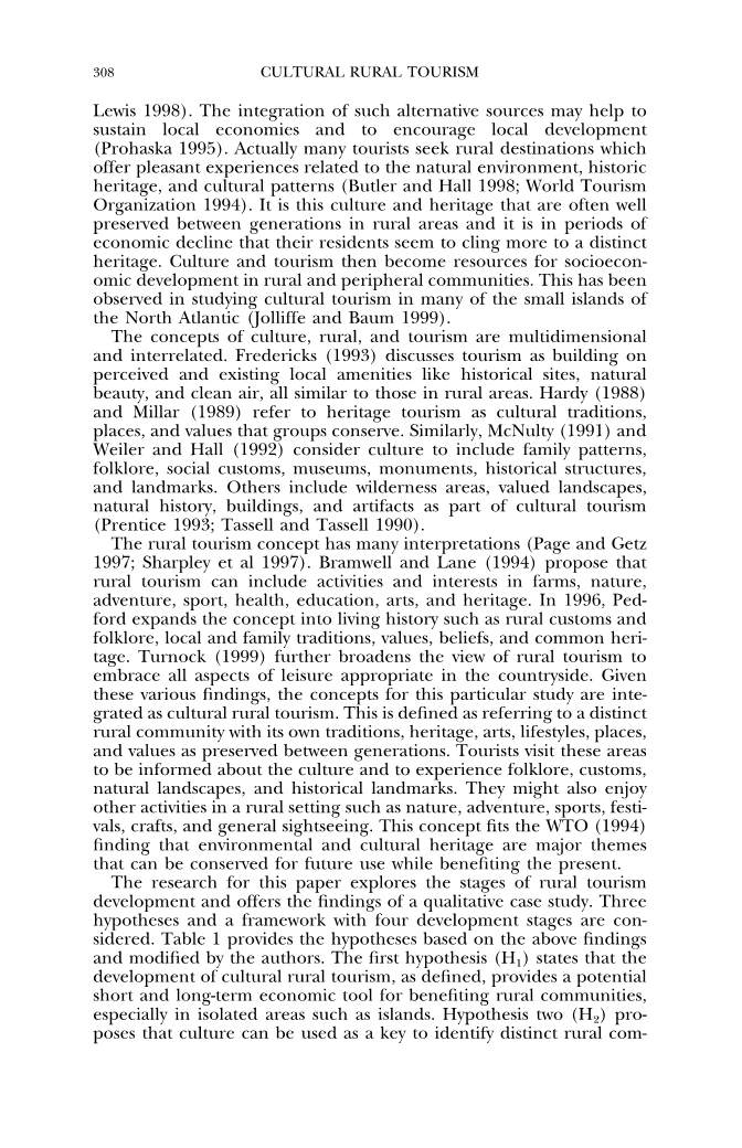 本文的研究探讨了乡村旅游发展的阶段,并提供了定性研究的结果。三个假设和一个包含四个发展阶段的框架被考虑其中。表1给出了基于上述发现并经作者修改而产生的假设。第一个假设(H1)指出,按照定义,乡村文化旅游的发展为农村社区提供了一种潜在的短期和长期经济工具,特别是在岛屿等偏远地区。假设二(H2)提出,文化可以作为识别不同乡村社区的关键,特别是岛屿社区,作为为游客提供教育、解说、娱乐和丰富内容的目的地。第三种假设(H3)认为,基于社区的发展规划和实施伙伴关系有助于确保文化乡村旅游战略的长期增长。农村社区如何发展持久的旅游活动,是规划者和决策者感兴趣的问题。本文探讨了农村如何发展这一过程的结构。本文介绍了加拿大东部的案例研究,并将研究结果与提出的框架和假设联系起来,为乡村旅游开发提供了有用的工具。
