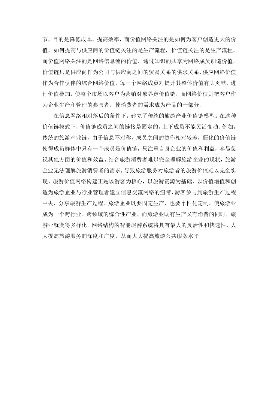 The best service is to create maximum value for all participants in the tourism activities. Wisdom tourism is not only a service platform, but also a resource sharing and value creation platform, through the platform of different subjects intertwined contact, build a tourism industry value network. Value network is a brand-new theoretical system based on customer-centric, complementary advantages of information technology and e-commerce infrastructure, and mutual cooperation of enterprises and institutions to create greater value of value creation system.