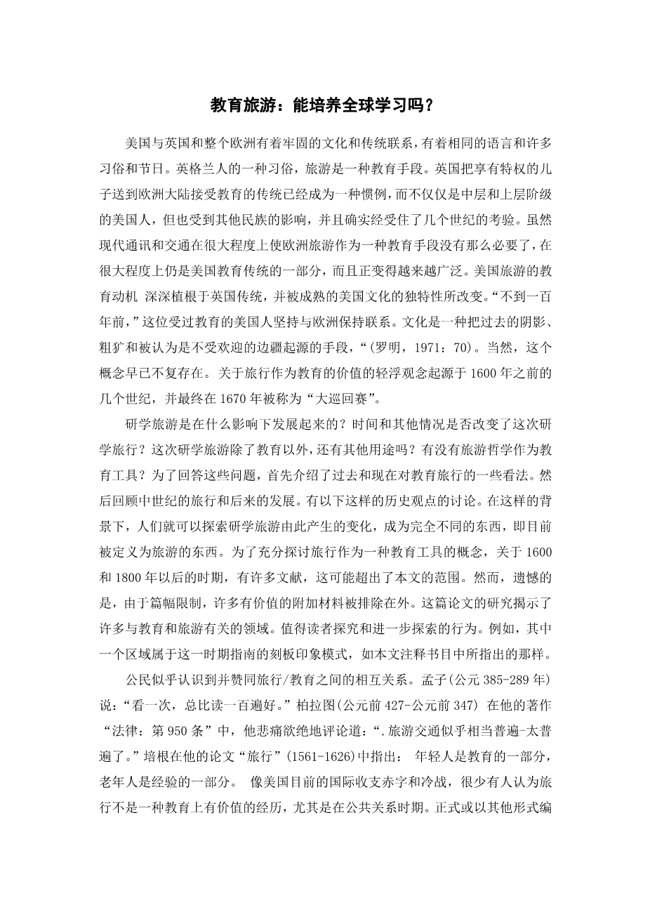Much of the world's learned citizens appear to recognize endorse a travel/education correlation. Mencius (AD. 385289B.C.)stated, To see once is better than to read a hundred times Plato(427BC.347 BC)ruefully commented in his book Laws. Section 950 that, "Tourist traffic appears to be fairly common rather too common. The literature is well fortified with favorable philosophies regarding travel and education. Political considerations not withstanding, such as America's current balance of payment deficit and cold wars, rare is the person indeed who believes that travel is not an educationally worthwhile experience especially when programmed into a curriculum, formal or otherwise. Some early educators actually incorporated travel into their curriculum to maximize learning. The foremost spokesman for the revolt against mere book-learning in the 1500s was the Frenchman Michel , generally known as Montaigne. He developed a pedagogy amply reflected by his saying, "A mere bookish learning is a paltry learning. Montaigne believed students needed some direct adventuring with the world, a steady and lively interplay with common folk, supplemented and fortified with trips abroad. Such contacts with mundane concerns serve not only to put an edge on the learner's faculties: they will appraise him of other people's humors, manners, customs, their politics, theology and Jurisprudence. their social system, and their public works(Meyer1972:231).